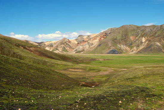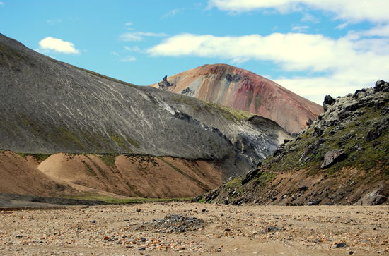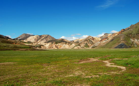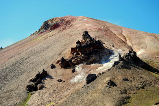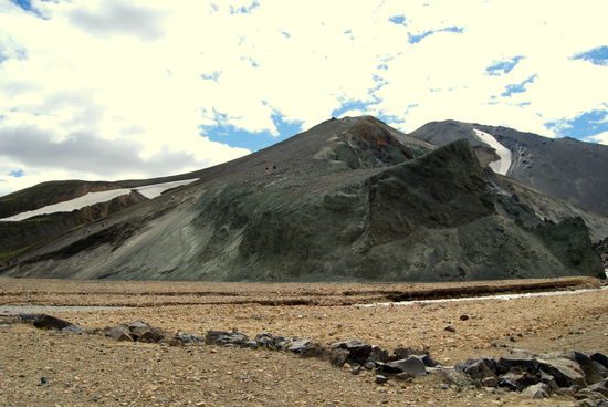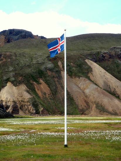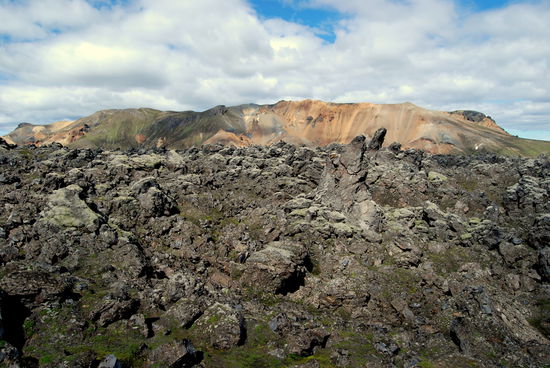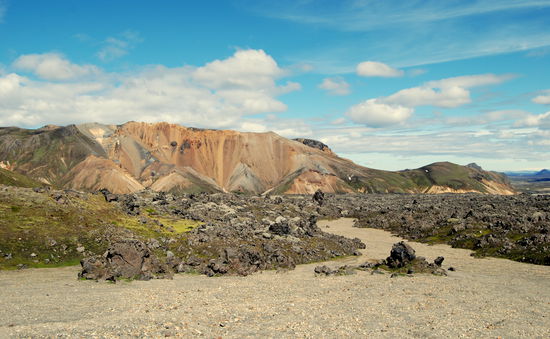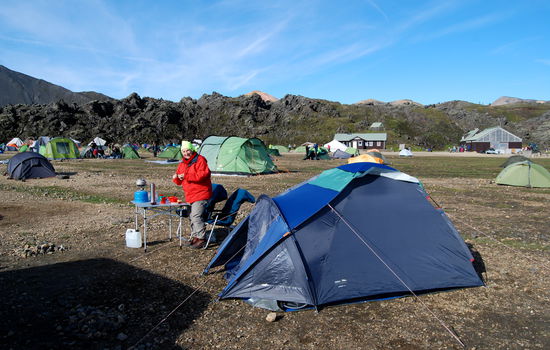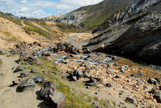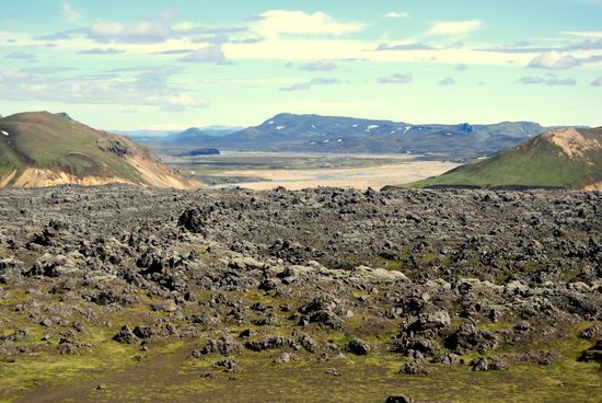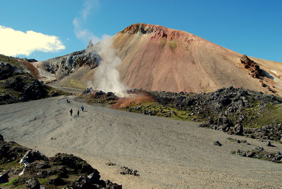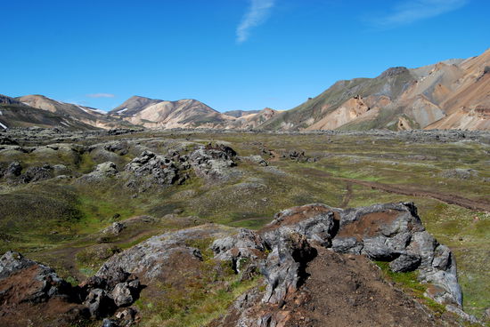Zuerst ging ich in der Ebene über den Campingplatz. Der Weg führte über den warmen Zulauf zum Badepott, dann ging es in Serpentinen auf das hohe Lavafeld. Es waren einige Wanderer unterwegs. Der Weg war etwas uneben und wurde an vielen Stellen repariert. Etwas weiter hinten gab es viele glatte, blauglänzende Basaltblöcke. Das sah toll aus in der Sonne! Bald kam ich an den Rand des Lavafeldes und bekam einen herrlichen Ausblick über eine große Ebene und die dahinter liegenden ockerfarbigen Berge. Hier waren schon viele Wanderer unterwegs in Richtung þórsmörk. Ich bog aber zu den dampfenden Bergen ab. Dort machte ich eine kleine Rast und genoß den Schwefelduft. Der Weg zurück in Richtung Campingplatz ging zuerst über große Lavablöcke. Hier kamen mir auch viele Touristen entgegen. Dann führte der Weg in ein Flußbett hinunter und am Rand des Lavafeldes entlang. Bald öffnete sich das Tal, und ich bekam Sicht auf den großen mäandernden Fluß, der am Campingplatz vorbei floß. An der Rettungsstation vorbei war ich bald wieder an unserem Zelt, wo mich Christa erwartete.
