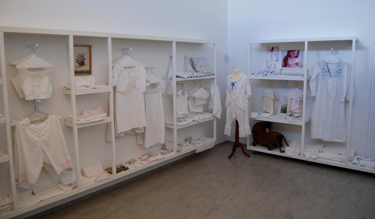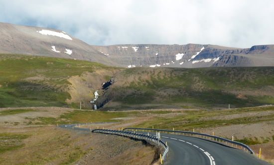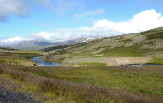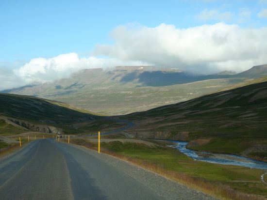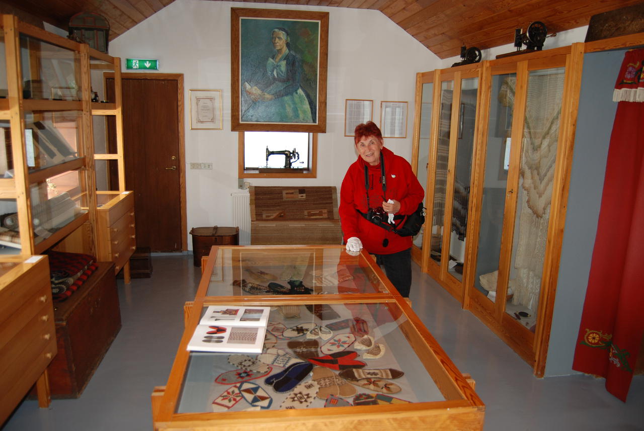 Aber erst einmal ging es ins Textilmuseum. Es war eine wirklich schöne Ausstellung. Sie war in verschiedene Bereiche unterteilt: Schöne bestickte Frauenunterwäsche und künstlerische Handarbeiten, Nationaltrachten aus den Jahren 1850 bis 1900, dann Erinnerungsstücke der Halldóra Bjarnadóttir (1873-1981), einer in Ísland sehr bekannten Frau. Und ein wichtiger Bereich war natürlich alles um die Wolle, von der Vergangenheit bis heute. Außerdem konnte man noch verschiedene Werkzeuge ansehen, welche für Handarbeiten benutzt wurden. Nach einer Kaffeepause fuhren wir weiter auf der 744 nach Sauðárkrókur. Die schöne grüne Strecke führte durch ein breites Tal, langsam ansteigend und dann wieder hinab zum Fjord. Der Campingplatz am Bad hatte ein neues Sanitärhaus und eine große flache Wiese.