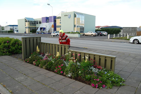 Am Abend machten wir noch einen Rundgang durch den Ort. Hier gibt es eine Bäckerei mit Ursprüngen von 1880. Wir schlenderten weiter durch die Aðalgata mit den schönen bunten Häuschen, gewöhnlich mit Blech verkleidet. Am Ende kamen wir zu einem Steinhaus mit einer Zapfsäule. Hier gibt es seit 1919 einen urigen Gemischtwarenladen, in dem man wohl alles kaufen kann, was der Ort braucht. Weiter spazierten wir in Richtung Hafen und dann den Strandweg entlang. An einer Bank fanden wir unser erstes GPS-Versteck.