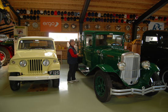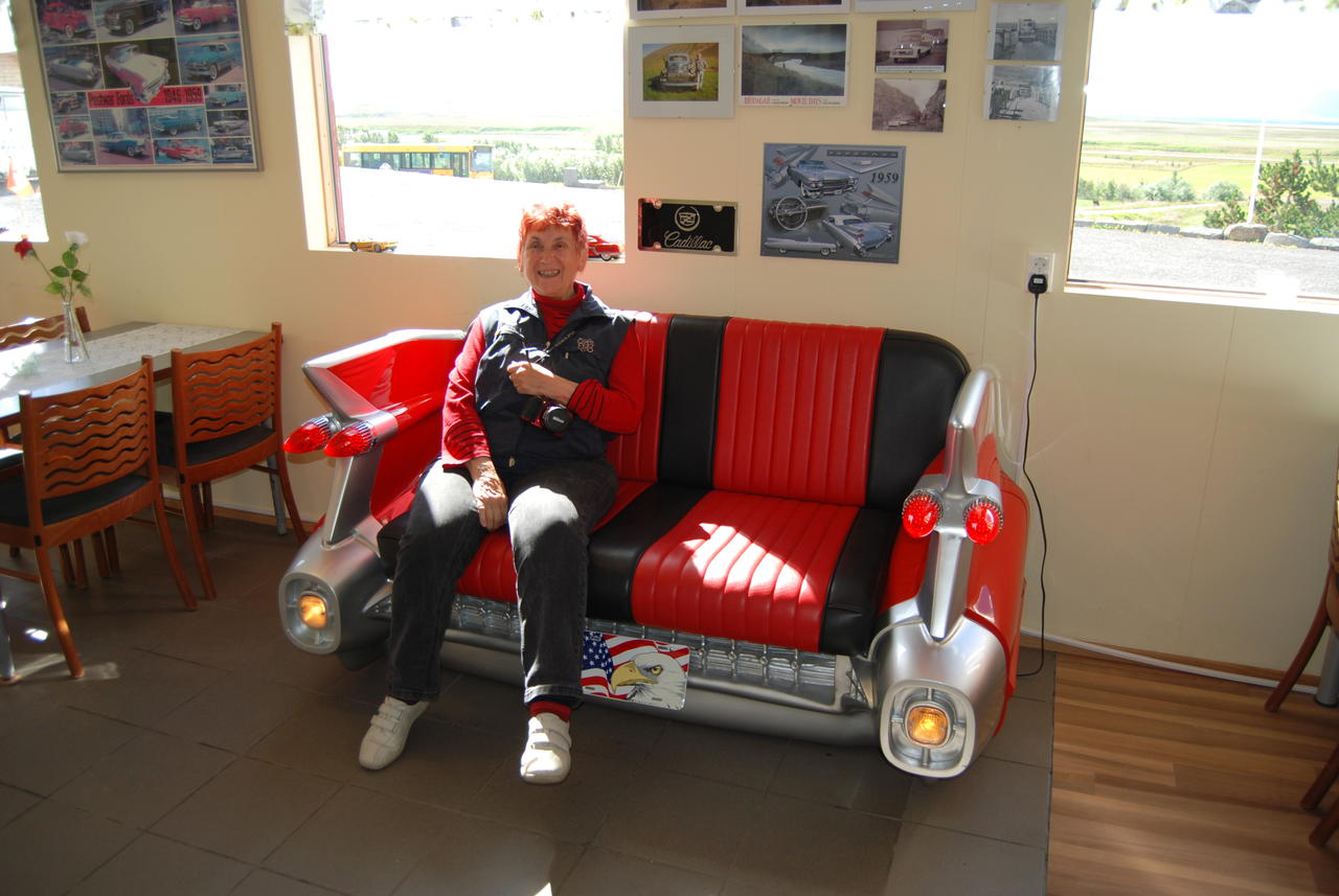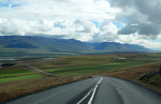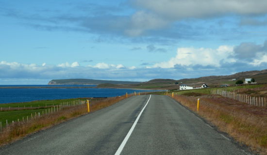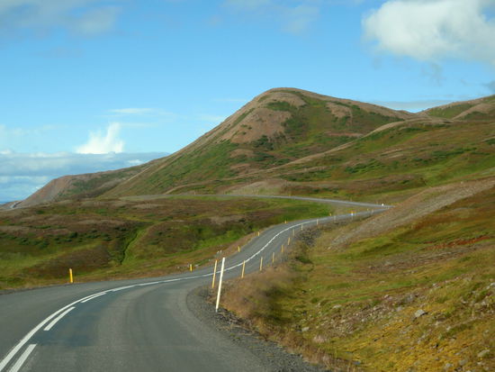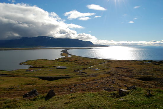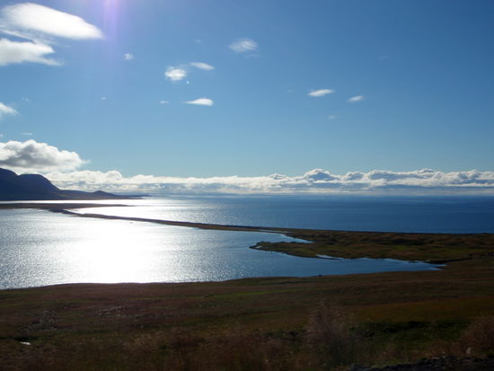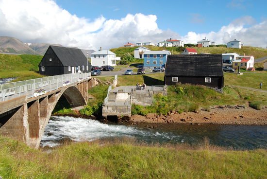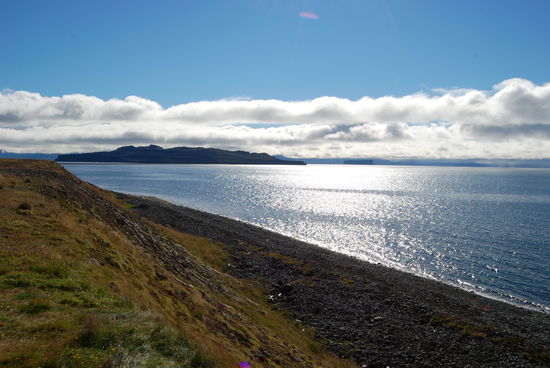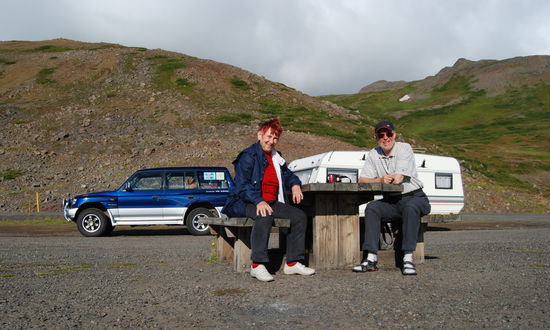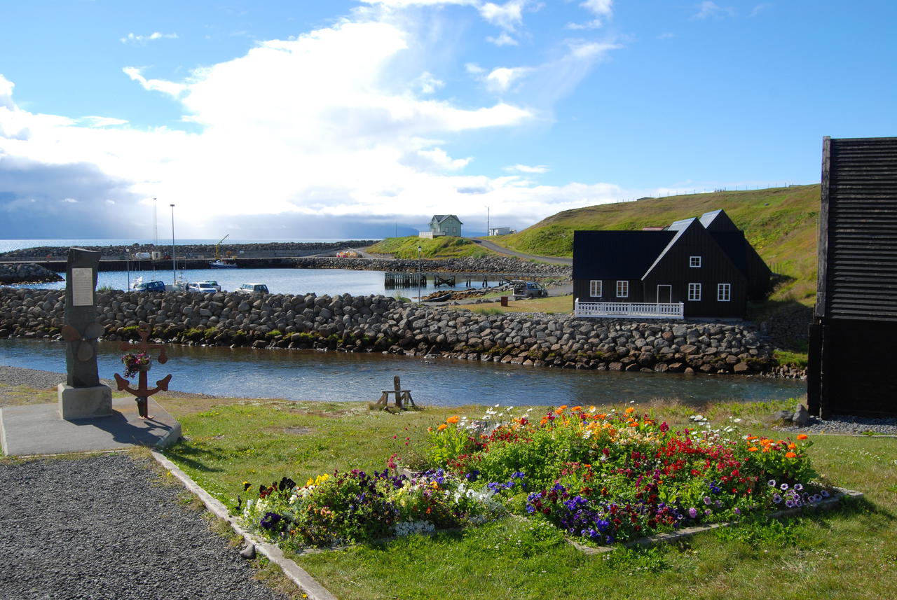 Wir gingen noch einmal durch den Ort. Der Kramladen hatte leider geschlossen. Also weiter zur Bäckerei. Hier fanden wir eine große Auswahl an guten Broten. Wir kauften 2 und auch noch Kaffeegebäck. Dann fuhren wir auf der 75 immer am Fjord entlang. Gleich nach dem Ort ging es über eine Brücke. Auf dem Parkplatz danach stand die Skulptur eines Fischers. Hier war früher eine Fähre. Auf der dem Fjord abgewandten Seite hingen dicke Wolkenbänder in den zum Teil schroffen Bergen. Weiter ging die Fahrt dann über die 76. Nicht sehr weit nach dem Abzweig wies ein altes Feuerwehrauto auf die Einfahrt zum Automuseum hin. Das war ein Erlebnis! Viele alte, z. T. restaurierte Wagen waren in mehreren Hallen ausgestellt, einfach toll! Die Straße führte am Skagafjörður entlang zum nächsten Ort Hofsós. Wir hatten gelesen, daß es hier eine Flaggennäherei gäbe. Sie lag unten an dem malerischen kleinen Hafen. Dies war ein hübscher kleiner Ort. Weiter ging es bergauf und bergab. Die Sonne schien und es war richtig warm. Wie schön, daß es mehrmals Parkplätze gab. So konnten wir die schöne Landschaft in Ruhe genießen. Im Fjord lagen riesige Felsinseln wie große Klötze. Der letzte Straßenabschnitt war nur teilweise asphaltiert, dann kam der einspurige Tunnel mit Ausweichstellen. Unsere Richtung hatte Vorfahrt. Kurz nach dem Tunnel erreichten wir Siglufjörður. Der Campingplatz war schon recht voll, aber wir fanden noch einen guten Platz. Unsere Manövrierhilfe erwies sich hier wieder einmal als sehr hilfreich. Am Abend machten wir noch einen Spaziergang durch den Ort und den Hafen, dann bereiteten wir Essen und ließen den Tag gemütlich ausklingen.