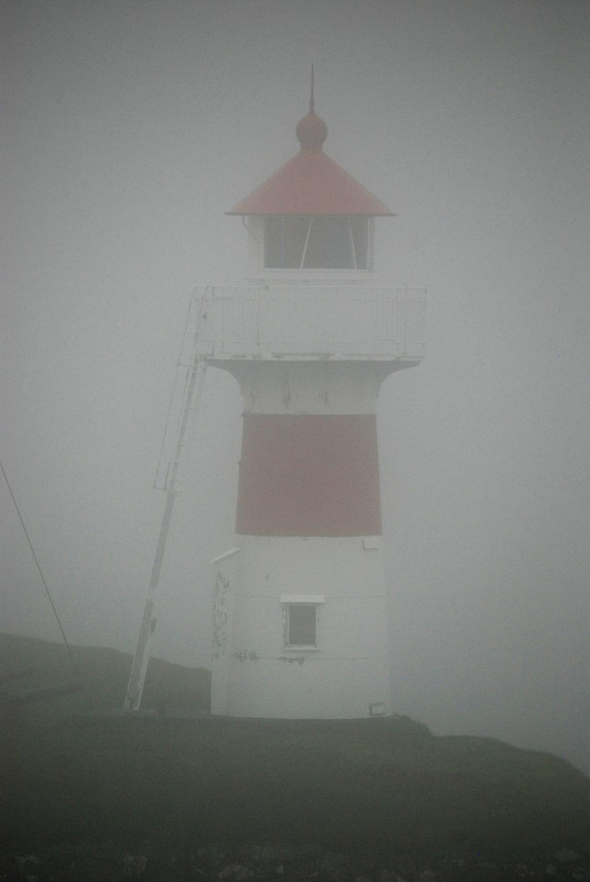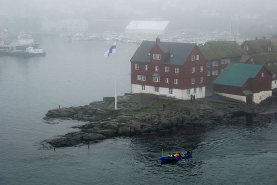Dank unserer Kabine im Mittelteil des Schiffes war der Seegang gut auszuhalten, und wir hatten gut geschlafen. Heute war es diesig, aber nicht kalt, so daß man gut draußen sitzen konnte. Laut Kapitän hatten wir 2 m hohe Wellen, die man kaum merkte. Leider wurde es immer diesiger, und es regnete leicht, als wir an den Färöer-Inseln anlegten. Eine Weile beobachteten wir das Ent- und Beladen der Fähre. Im Hafenbecken fuhren große Ruderboote und übten ihre Manöver.