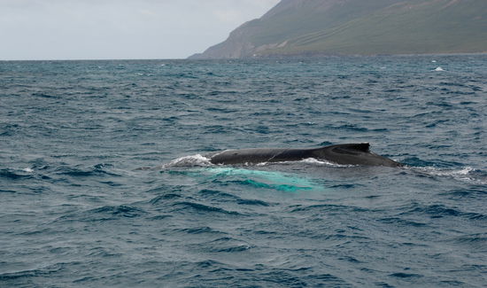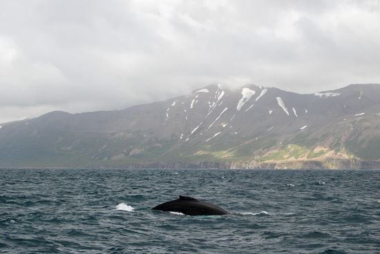 Am Vormittag begann sich der Wohnwagenplatz langsam zu lichten. Wir wollten aber noch bleiben und um 13 Uhr zur Walbeobachtung hinausfahren. Dick verpackt ging es los. Der Begleiter erklärte uns, welche Wale hier vorkommen. Wir sollten viel Glück haben. Es war ganz schön kabbelig. Wir mußten erst einmal fast über den ganzen Eyafjörður fahren, bis wir weit entfernt Wale springen sahen. Nach einiger Zeit schwammen die Buckelwale mal rechts, mal links von uns, manchmal weiter entfernt, dann wieder ganz dicht. Durch das Ausatmen (Blasen) konnte man sie gut ausmachen.