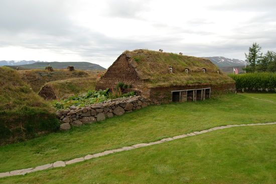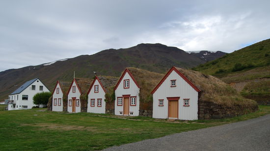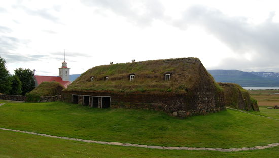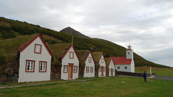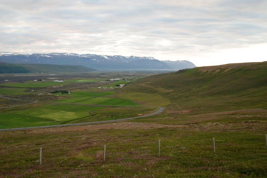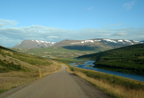 Wir suchten uns in der Stadt einen Parkplatz und gingen erst einmal essen und anschließend einige Mitbringsel einkaufen. Unser nächstes Ziel war der Torfhof Laufás. Er sollte nach unserem Buch eigentlich bis 18 Uhr geöffnet sein, war aber schon geschlossen. Die Öffnungszeiten waren inzwischen geändert worden. So sahen wir uns diese sehr gut erhaltenen Gebäude nur von außen an. Weiter ging es über die 835 durch Dalsmynni. Es war ein geradezu lieblich grünes Tal. Vor der Mündung in den Fjord hatte der Fluß eine tiefe Schlucht eingeschnitten, im oberen Lauf war er recht breit mit vielen Sand- bzw. Schotterbänken. Hier wurde sehr viel aufgeforstet. Alle Hänge waren nun bewaldet. Dann kamen wir auf die N1. Sie war welliger als der Grusweg vorher, der sich auch mit Wohnwagen sehr gut fahren ließ. Wir verließen die 1 wieder und fuhren auf die 85. Kurz darauf standen ein roter Lastwagen und eine Feuerwehr an der Straße. Hier befindet sich ein weiteres Automuseum, das wir uns noch ansahen. Ähnlich wie bei dem vorher beschriebenen waren alle Fahrzeuge liebevoll restauriert. Weiter ging die Fahrt ein Stück auf der 845 und später auf der 853. Eine sehr steile, aber inzwischen befestigte Straße führte dann über den Berg auf die 87. In Richtung Húsavík erreichten wir bald beim Bad Heiðarbær den Campingplatz, wo wir übernachten wollten.