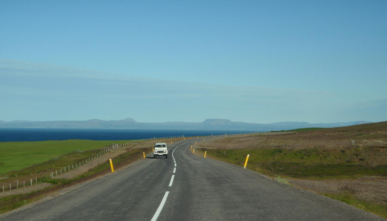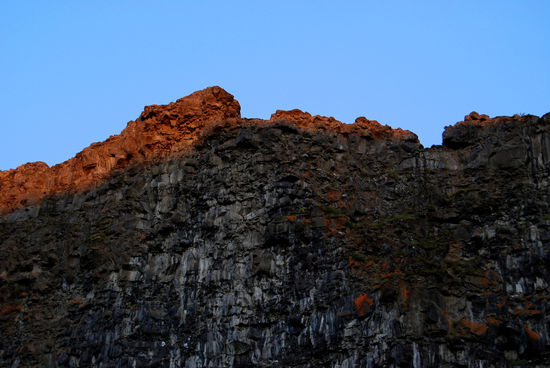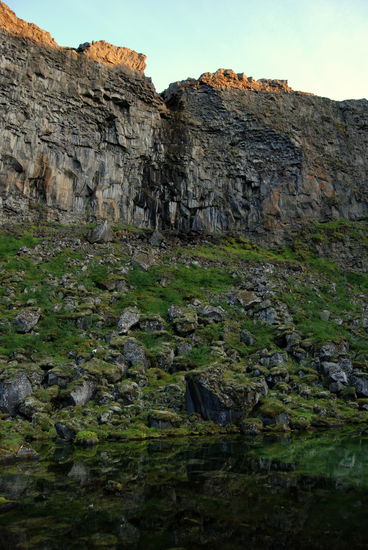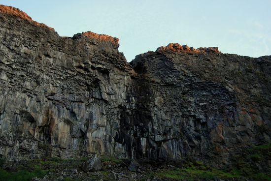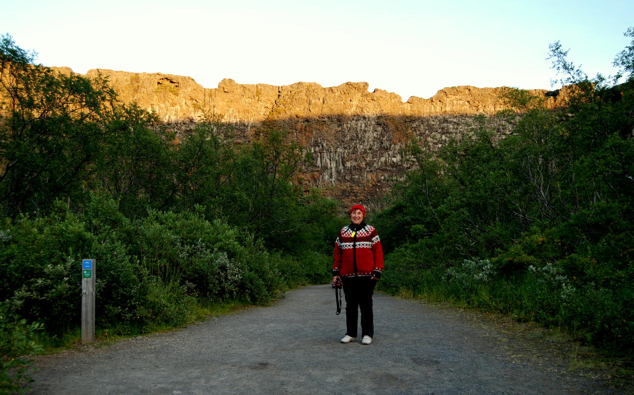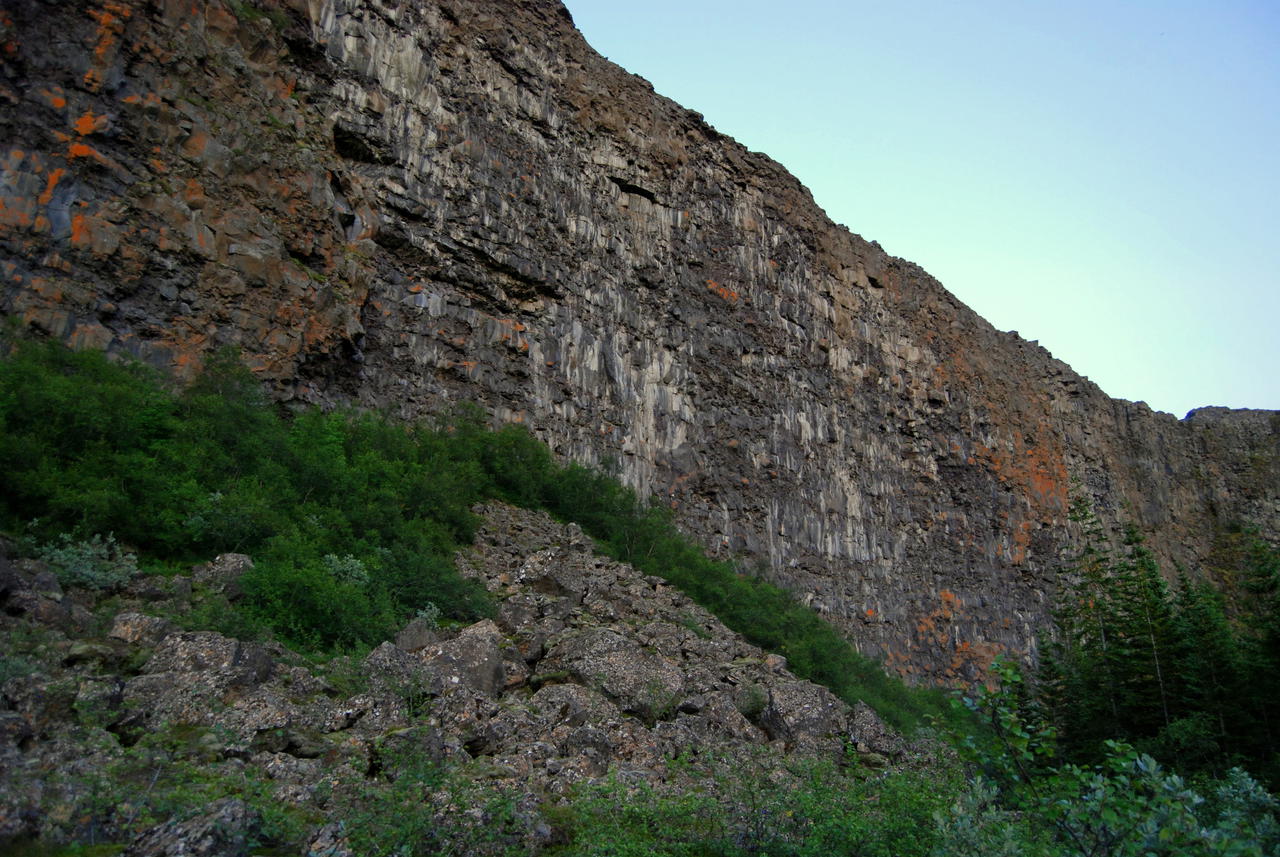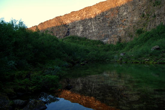Nach dem Frühstück gingen wir erst einmal ins Schwimmbad. Das Wasser war herrlich warm. Anschließend tauschten wir in dem 40° heißen Pott mit 2 jungen Deutschen noch Erfahrungen aus. Dann wurde der Wohnwagen startklar gemacht. Vor der Abfahrt kauften wir bei den gegenüberliegenden Treibhäusern Tomaten, Paprika und eine Gurke. Dann fuhren wir weiter bis nach Húsavík. Gleich am Ortsanfang lag ein Supermarkt, wo wir einkauften. Es gab fangfrischen Fisch, und wir hatten Hunger. So nahmen wir uns Kartoffelsalat und Fisch mit. Im Hafen war genug Platz, so daß ich gleich den Fisch in die Pfanne legte. Das war ein gutes, schnelles Gericht. Anschließend bummelten wir durch den Ort. An der 1907 aus norwegischem Holz gebauten Jugendstilkirche fanden wir wieder ein GPS-Versteck. Nach einem kurzen Bummel zurück zum Wohnwagen am Hafen ging es weiter. Die 85 ließ sich gut fahren, wir wünschten uns nur noch mehr Parkplätze. So konnten wir immer nur während der Fahrt schnell mal ein Foto aus dem Fenster machen. Als wir auf eine Bergkuppe kamen, sahen wir dann das riesige Mündungsdelta des Flusses Jökulsá á Fjöllum. Hier gab es dann doch einen Parkplatz mit herrlicher Aussicht. Steil ging die Straße bergab. Über eine Brücke gelangten wir in das flache Mündungsgebiet. Schwarzer Sandstrand und große Felder mit Lavabuckeln und feuchte Wiesen wechselten sich ab. Einige große Lavafelder waren eingezäunt und mit kleinen Fichten bepflanzt. Kurz vor unserem Ziel tauchten plötzlich hohe, steil aufragende Wände auf. Als lange Bänder liefen sie parallel nebeneinander her. Hier bogen wir zum Campingplatz ab. Auch er lag am Fuße solch einer Wand. Mit beginnendem Sonnenuntergang wurden die Bergwände schön angestrahlt. Wir fuhren noch bis ans Ende dieser Mauern,ca. 5 km. Ásbyrgi ist hufeisenförmig und der Sage nach der Hufabdruck von Odins Pferd Sleipnir. Die Basaltwände ragen bis zu 100 m hoch. Hier war einmal ein Wasserfall der Jökulsá á Fjöllum bis diese den Lauf verlegte. Vom Parkplatz aus machten wir einen kleinen Spaziergang zu dem kleinen See unmittelbar vor der Felswand. Langsam wurde das Sonnenband am oberen Rand immer schmaler, dann gingen wir einen Waldpfad zurück zum Auto.