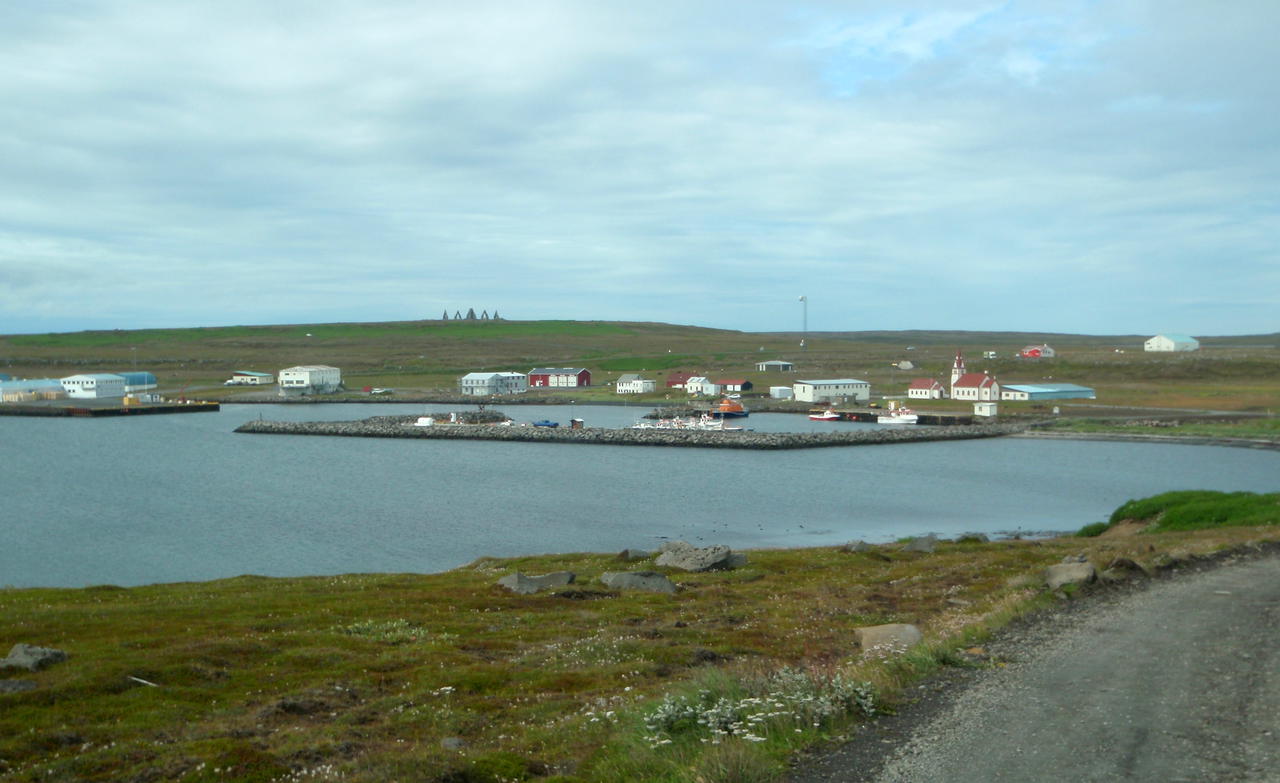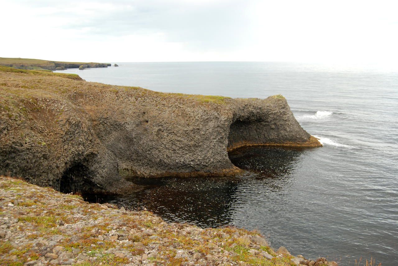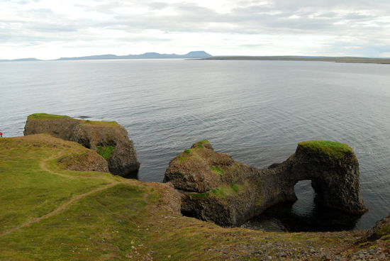 Weiter ging es bis zu einem Abzweig nach Rauðanes. Der Weg war mit dem Wohnwagen etwas schwierig zu fahren, lohnte sich aber sehr. Auf einem Wanderweg entlang der Küste hatte man Ausblicke auf bizarr geformte Felsformationen, in die das Meer Durchbrüche und Höhlen gewaschen hatte. Mit etwas Glück konnte man hier auch Papageitaucher sehen. Wieder zurück am Wohnwagen machten wir uns erst einmal Kaffee. Danach ging es weiter um den Fjord herum nach Þórshöfn. Der Campingplatz war recht groß mit vielen guten Stellplätzen. Hier wollten wir 2 Nächte bleiben. Morgen sollte es nur mit dem Auto einen Ausflug an die Nordostspitze der Halbinsel Langanes geben.