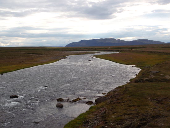 Dann fuhren wir weiter auf der jetzt asphaltierten Straße 874. Eigentlich wollten wir die alte Strecke fahren, verpaßten aber die Abfahrt. Das war vielleicht ganz gut, so blieb unserem Gespann die Holperei erspart und uns auch. Die Strecke war recht schön. Nach einem Anstieg über einen Höhenzug bekamen wir eine wunderschöne Aussicht auf den Fjord und die umliegende Landschaft. Schön, wenn an solchen Stellen dann Parkplätze sind, wie hier. Auf dem Parkplatz gab es einige Informationstafeln, u.a. über die Erkundung der Streckenführung der neuen Straßen. Für uns sah es so aus, als wäre die alte Strecke nicht mehr durchgängig befahrbar.