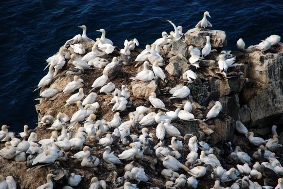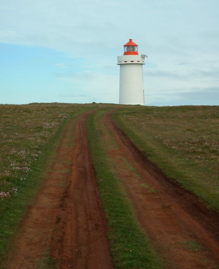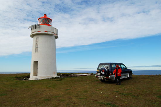Unser erstes Ziel an der abwechselungsreichen Strecke war der Vogelfelsen „Stóra Karl“. Vorgelagert vor der Küste dient ein großer zerklüfteter Felsblock vielen hunderten Baßtöpeln als Nistplatz. Die Steilküste ist bevölkert von Dreizehenmöwen. Papageitaucher, die hier auch sein sollten, waren wohl schon aufs Meer gezogen. Die Baßtöpeljungen waren verschieden alt. Manche hatten noch den dicken, hellen Babyflaum, andere waren schon ganz grau. Eine Weile schauten wir ihnen zu, dann ging es weiter in Richtung Leuchtturm. Weit entfernt konnten wir ihn bald sehen, rote Fahrspuren führten zu ihm hin. Leider war er verschlossen, Rainer wäre gern hinaufgestiegen. Der kalte Wind trieb uns nach einer kleinen Besichtigung der Umgebung wieder ins Auto, wo wir erst einmal Kaffeepause machten, bevor es an die Rückfahrt ging. Holterdiepolter ging es bergauf, bergab, immer beäugt von den vielen Schafen, die hier weideten.