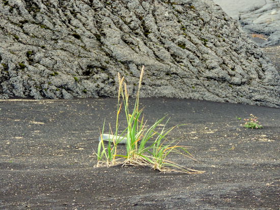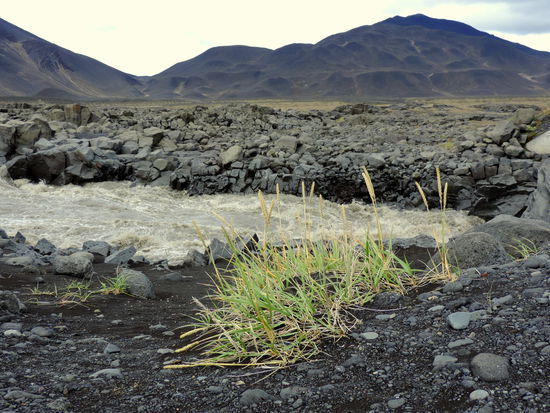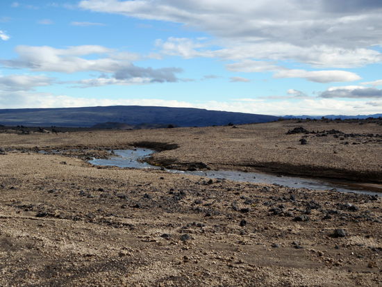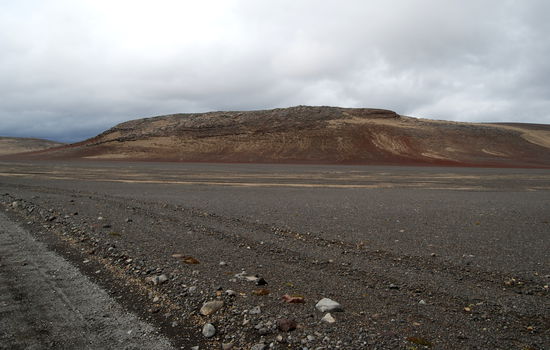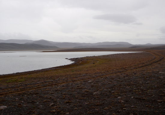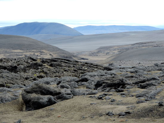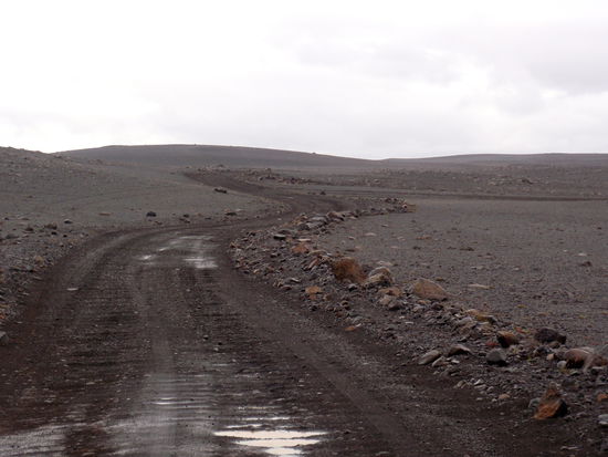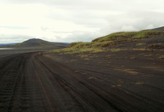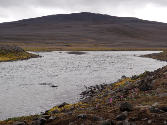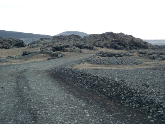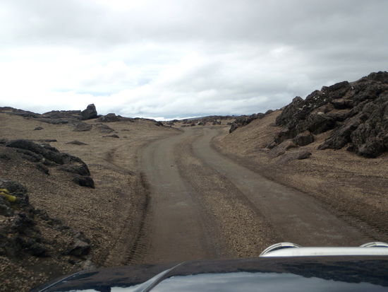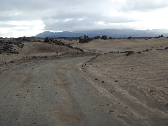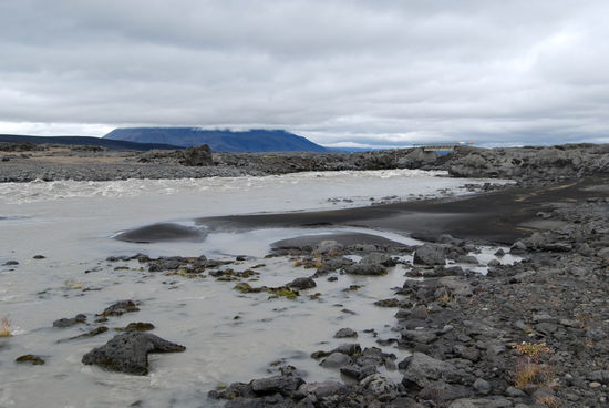 So hatten wir uns das nicht vorgestellt. Es regnete. Wir packten trotzdem zu Ende und fuhren los. Ein Blick in die Wetterprognose zeigte uns, daß die erwartete Besserung auf dem Weg war. Langsam wurde auch der Regen weniger und hörte gegen Mittag ganz auf. Der erste Teil der Strecke war gleichförmig und trotzdem schön: Schwarze Wüste mit vielen kleinen Steinen, in der Ferne die Berge, ab und zu kleine Seen. Der Fahrweg war sehr unterschiedlich, von gut und zügig zu befahren bis ziemlich schlecht. Zweimal mußten wir durch Furten. Die erste war recht tief. Dann veränderte sich die Landschaft. Die nahen Berghänge hatten ganz helle Streifen, und auch der schwarze Sand war durchsetzt damit. Es war Bims. Dazwischen ragten schwarze Lavatürme aus dem Sand. Langsam wurde die Lava immer dichter und schroffer. Die Straße schlängelte sich hindurch, teilweise tief eingeschnitten. Wir mußten sehr vorsichtig fahren. Zweimal konnten wir einen Fluß über Brücken queren, zuerst die Kreppa und später die Jökulsdá á Fjöllum. Bei der zweiten Brücke rauschte der gewaltige Fluß mit einem Wasserfall vorbei. Wir kannten ihn schon von der Herðubreið 2010. Es ist derselbe, der auch den Dettifoss speist. Fast endlos schlängelte sich der Weg weiter. Jetzt ging es durch spitze, rauhe Lavafelder und am Ende durch Sand. An dem Höhenzug Herðubreiðartögl stießen wir auf die von Norden kommende F88, die wir schon 2010 zur Herðubreið gefahren waren. Bald darauf hatten wir es geschafft, wir waren an der Askja. Der Campingplatz heißt Dreki.