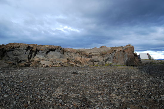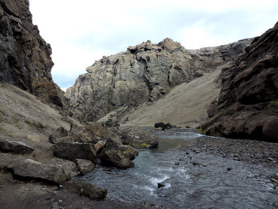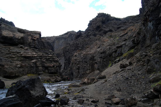 Das Wetter war noch gut, aber sehr windig. Wir bauten schnell auf, aßen noch etwas und sahen uns die Drachenschlucht, Drekagil an, die hier beginnt. Es ist eine enge Schlucht mit interessanten Lavaformationen, die teilweise Figuren und Höhlen bilden. Durch die Schlucht fließt, teilweise mäandernd, ein Bach. Anfangs konnten wir beide über die Schotterbänke und Hügel an den Rändern entlang wandern. Weiter hinten waren größere Schritte über das Wasser nötig. So ging Rainer allein weiter und erreichte schließlich einen wunderschönen Wasserfall. Zurück am Zelt aßen wir an einer aufgestellten Bank zu Abend und genossen den Blick auf die Herðubreið.