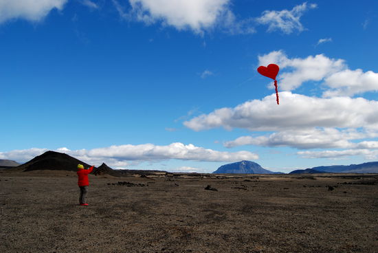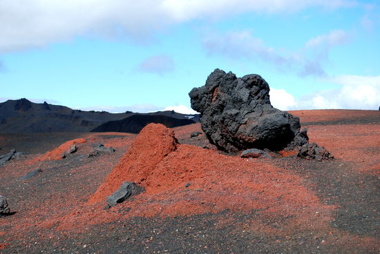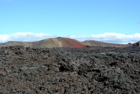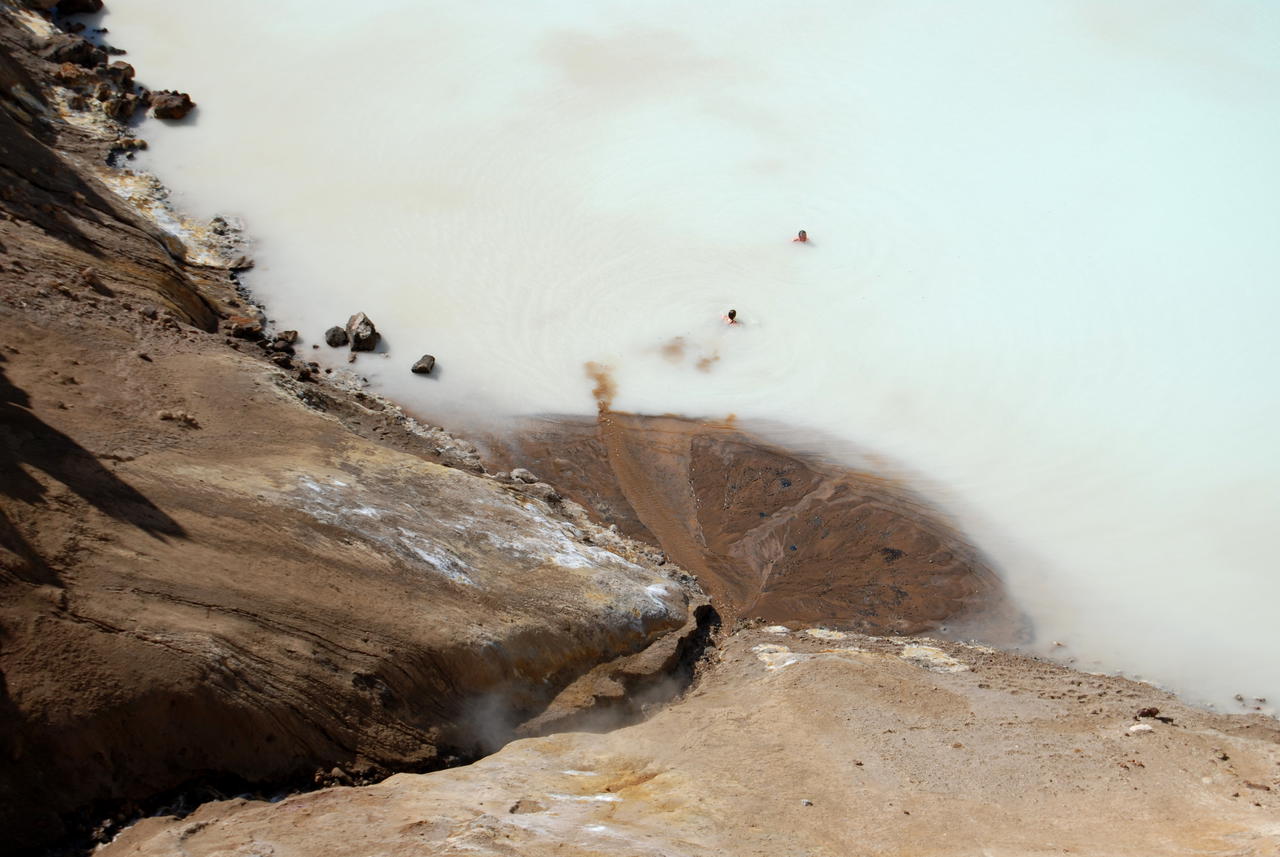 Am nächsten Tag fuhren wir zu Askja hinauf. Dyngjufjöll ist der Zentralvulkan eines ca. 200 km langen Spaltensystems. Er hat 3 Calderen (kesselartige Einbrüche), die größte heißt Askja, wie auch meist das ganze System bezeichnet wird. Die letzten Ausbrüche waren Anfang der 1960er Jahre. „Bewegung“ im System ist aber praktisch immer. Vom Parkplatz aus mußten wir erst einen kleinen Wall überwinden, dann ging es ca. 2 km durch eine feine Lava- und Bims-Ebene. Hier fanden wir schwarzen und sogar roten Bimsstein! Touristen sahen wir jetzt überall, so gab eine richtige „Völkerwanderung“ zum Viti, einem Explosionskrater, der u.a. bei den großen Ausbrüchen 1875 entstand. Dieser Krater ist mit milchig blaugrünem Wasser gefüllt und gut 20° warm. Viele Leute kletterten den steilen, rutschigen Pfad hinunter, um zu baden.