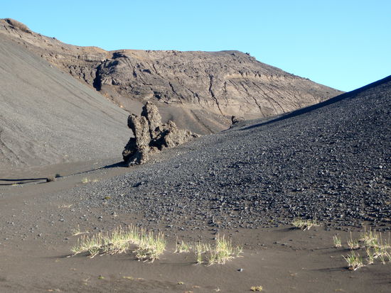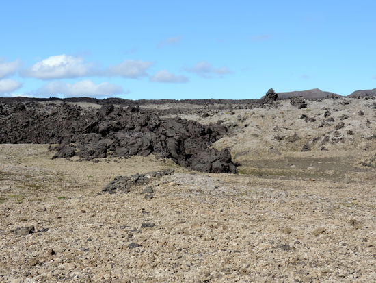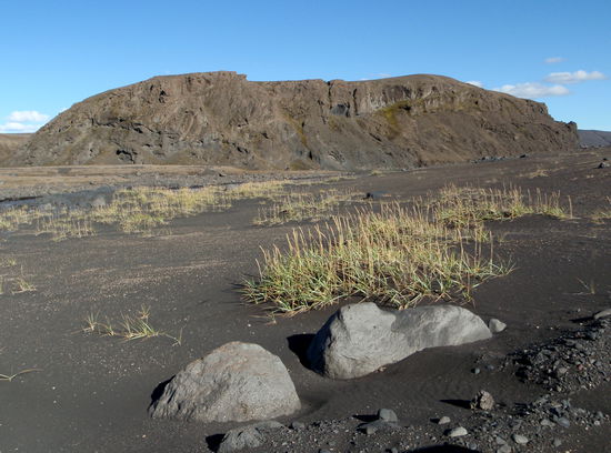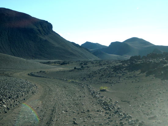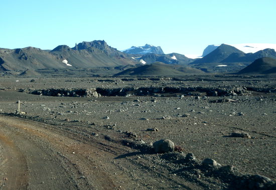 Unser nächstes Ziel war Kverkfjöll, auch dies ein Vulkan am Rande des größten Gletschers Europas, dem Vatnajökull. Zunächst fuhren wir den gleichen Weg zurück bis über die Brücke über die Jökulsá á Fjöllum. Kurz danach kam der Abzweig auf die F902. Nun fuhren wir direkt nach Süden auf den Vatnajökull zu. Teilweise ging der Weg über weite offene Ebenen, teilweise aber auch stark geschlängelt mit hohen Lavawänden durch einen Gebirgszug. Unterwegs fragte Christa plötzlich, ob es hier denn auch Geysire gibt. Wir hielten an und sahen im Fernglas, daß weiße Dampfwolken aus schwarzer Lava austraten: Das war das neue Lavafeld (nýja-Holuhraun) vom letzten Jahr! Es liegt zwischen Askja und Vatnajökull und dampft weiterhin. Das erklärte auch, daß hier der Gletscher, auf den wir zufuhren, mehr schwarz als weiß war. Das war Asche! Bald darauf erreichten wir die Hütte Sigurðarskáli. Hier waren sogar schmale Grasstreifen für die Zelter angelegt. Die Leute der Hütte waren sehr nett und wiesen uns auf eine Bilderschau am Abend hin. Diese ging leider etwas in der Begeisterung einer italienischen Reisegruppe unter, die sich über ihre Spaghetti freuten !