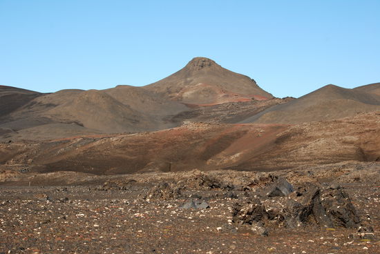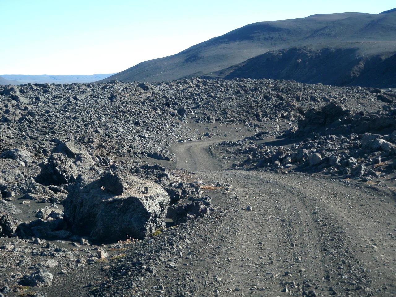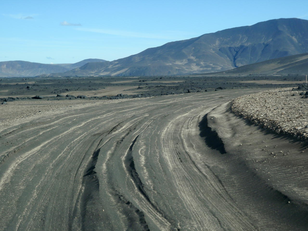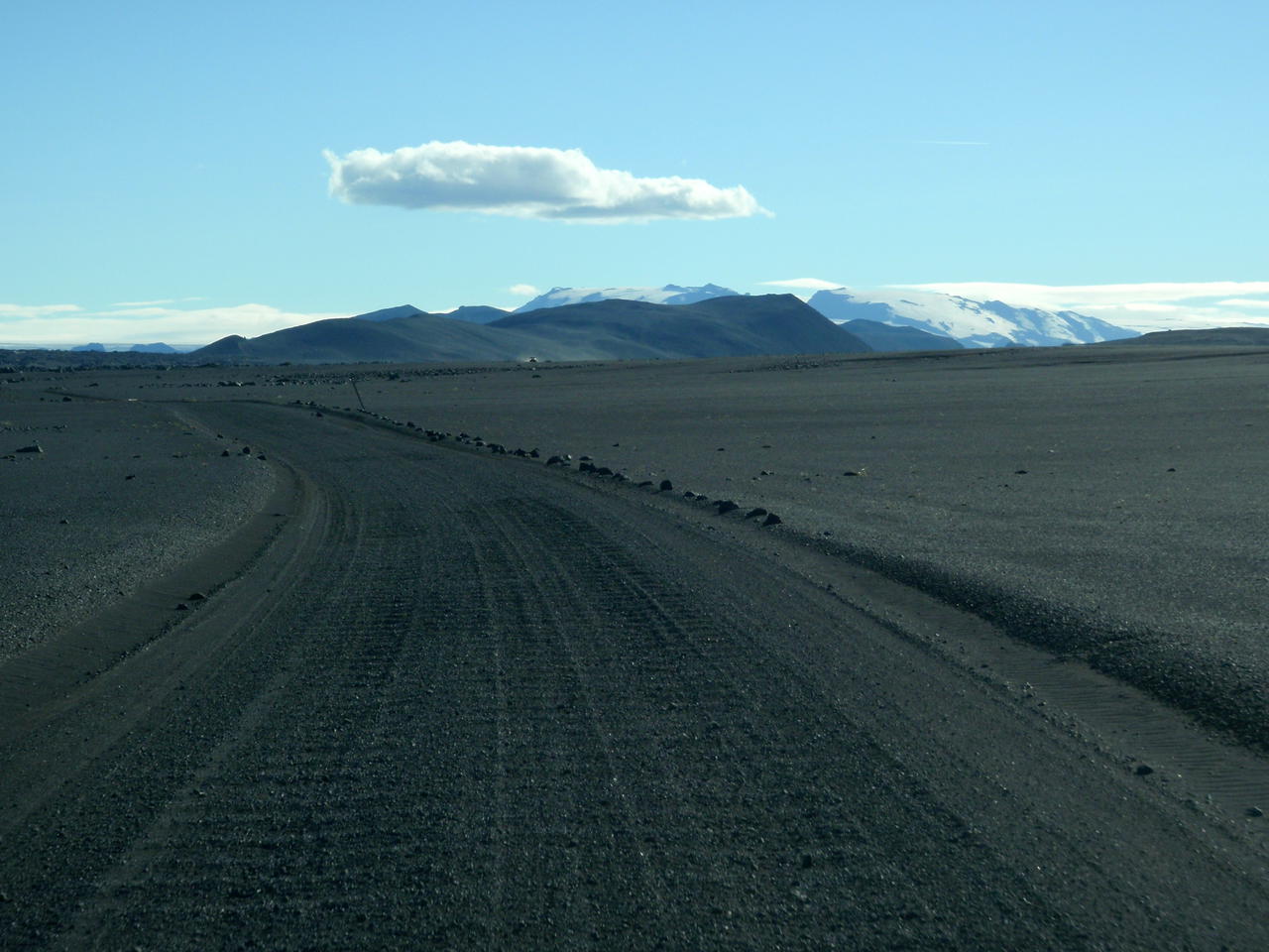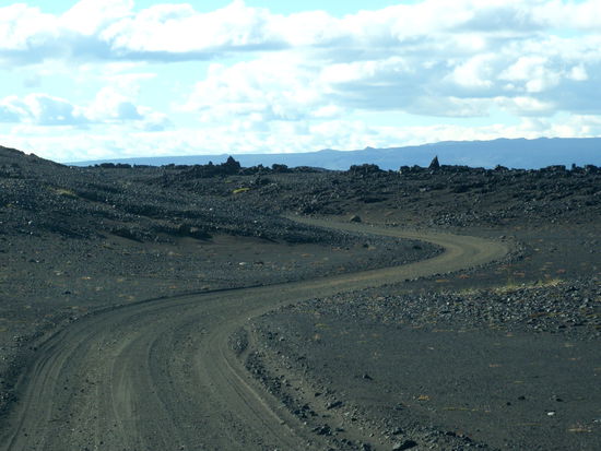 die Straße führte hinunter in die helle Bimswüste, am Horizont unser Ziel von morgen, Snæfell, der höchste Berg Íslands außerhalb der Gletscher