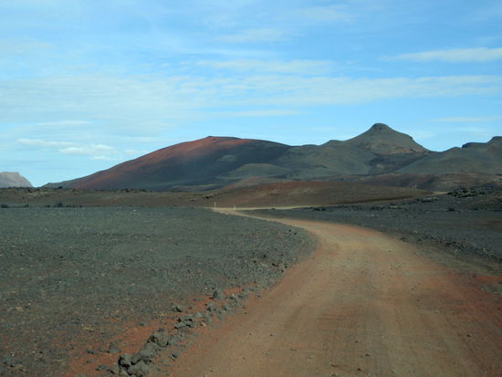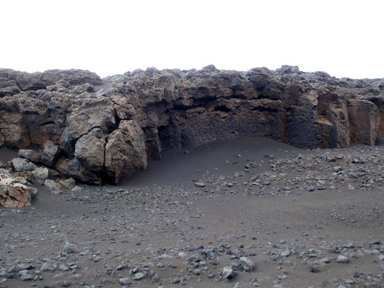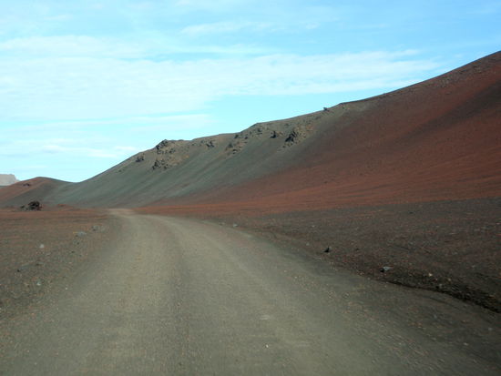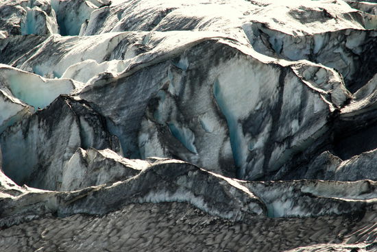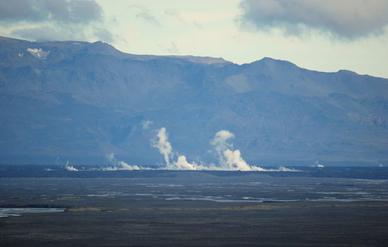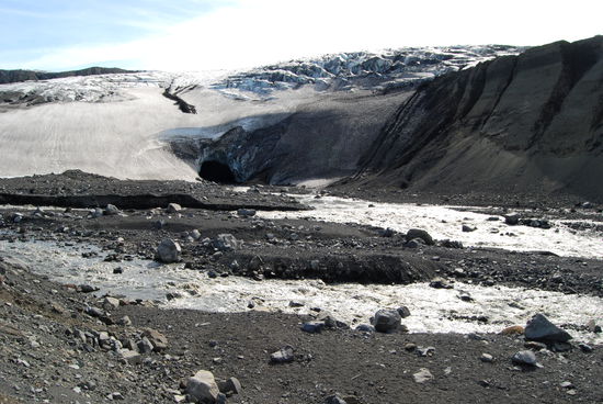 Wir frühstückten vor unserem Zelt in der Sonne mit Blick auf die neue Lava und die Dampfwolken. Dann fuhren wir erst einmal zum Gletscher hinauf, der dort auch eine Höhle bildet. Leider kommt man nicht mehr direkt dorthin, da die Brücke über den Fluß kurz nach dem Bau weggerissen wurde, als er sein Bett veränderte.