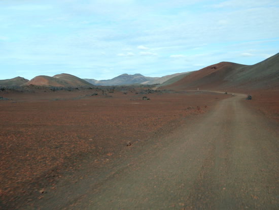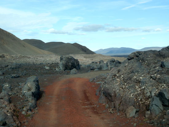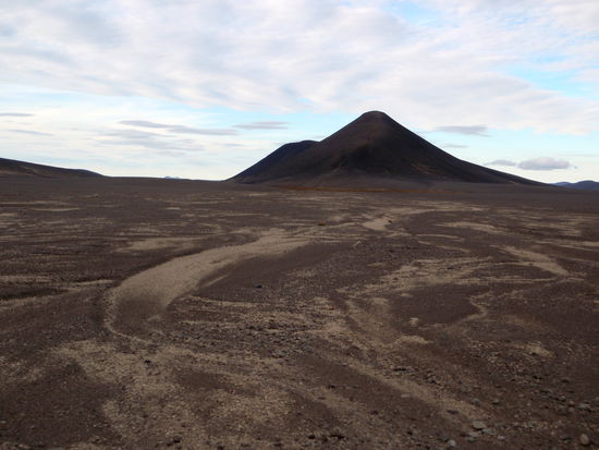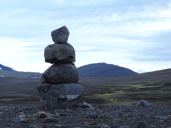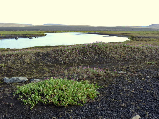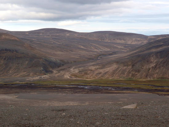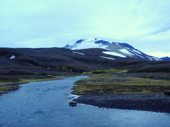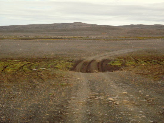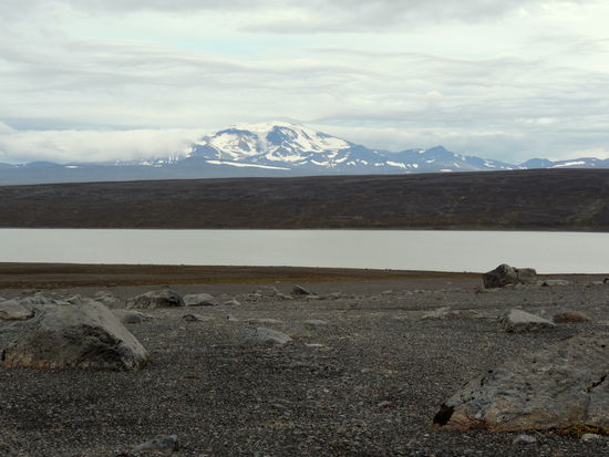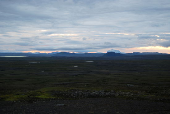 Unser nächstes Ziel war Snæfell, der höchste Berg Íslands außerhalb der Gletscher. Wir fuhren über eine Parallelstrecke, die F903. An einer großen Vadställe standen mehrere Fahrzeuge des Nationalparks. Hier stand sogar eine Flaggenstange, und hinter einem Berg gab es auch eine Hütte. Kurz danach kam nämlich den Abzweig zur Oase Hvannalindir, die zum Nationalpark gehört. Das Ökosystem dort ist einzigartig, da es seit der Besiedlung nicht durch Schafe beweidet worden war. Nur Geächtete fanden dort wohl eine Zeit lang Unterschlupf. Seit 1973 ist das Gebiet Naturreservat. Wir fuhren aber nicht hinein, zelten ist dort verboten. Weiter ging es durch eine zweite schöne Vadställe zurück zur F910. Wir fuhren ein ganzes Stück auf der uns schon bekannten Piste weiter. An einer Weggabelung überlegten wir eine Weile, ob wir es wohl noch bis zum Snæfell schaffen würden. Wir entschlossen uns, es zu versuchen. Die Piste hatte keine Nummer und  führte uns über eine Hochfläche. Es gab nur eine dünne Fahrspur, die sich teilweise sogar gabelte. Die Landschaft war sehr gleichförmig, aber interessant. Dann führte die Piste steil hinunter zu dem Stausee Hálslón, der eine tolle Schlucht überschwemmt hat, um Strom für eine Aluminiumhütte zu liefern. Über den Staudamm führte uns dann eine Asphaltstraße zum Abzweig der F909 zum Snæfell. An der Hütte dort war alles menschenleer, keine Zelte, keine Autos, und es wurde schon dämmrig. Die Hütte war offen, der Ofen gefeuert und die Telefonnummer des Rangers angeschlagen, der nach einiger Zeit von seiner Inspektionsfahrt zurück kam. Obwohl der Preis mit
