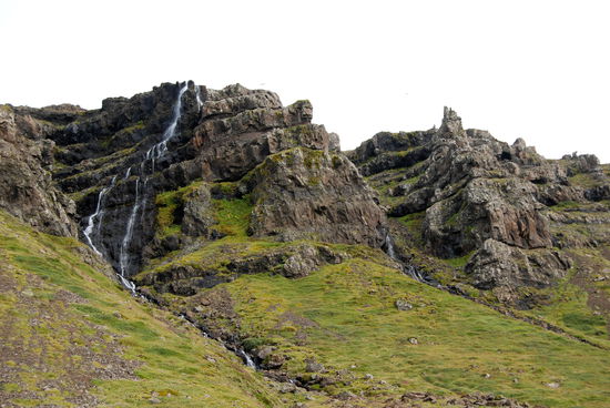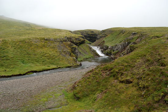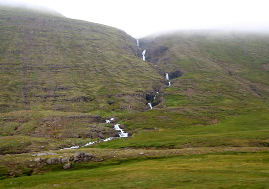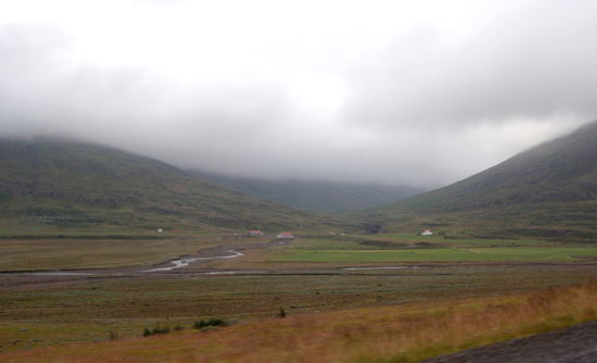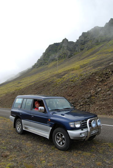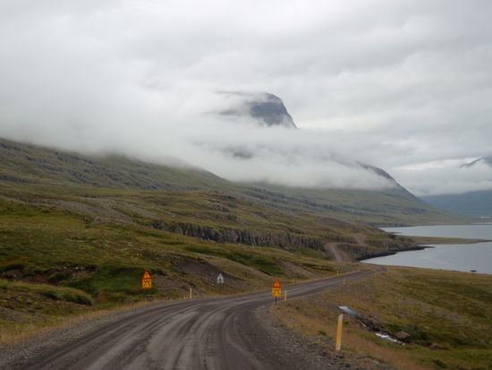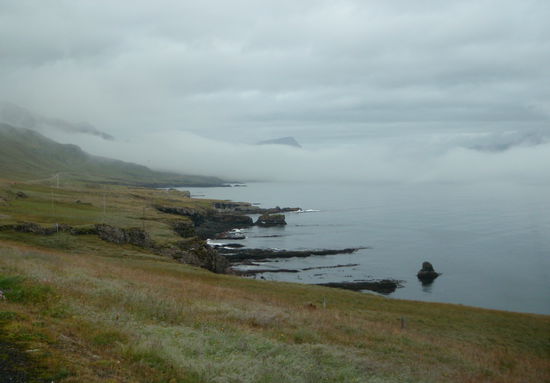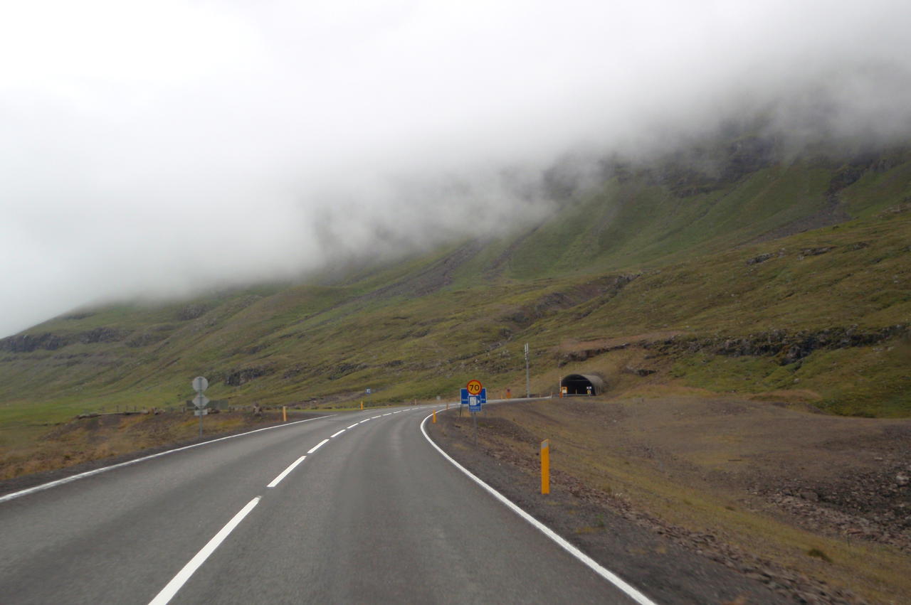 Die Straße um die Halbinsel war zum großen Teil nicht asphaltiert. Wir wollten sie aber fahren, obwohl in den Fjorden und an den Berghängen Nebelschwaden hingen. Das sah sehr interessant aus. Es gab eine Tunnelverbindung zwischen den Fjorden. So ließen wir den Wohnwagen auf dem Campingplatz stehen und fuhren los. Zeitweise hatten wir freie Sicht auf das Meer und die Berghänge. Dann wieder fuhren wir durch dichten Nebel. Gegenüber von Eskifjörður machten wir einen Abstecher zu einem kleinen Leuchtturm, der bald im Nebel verschwand. Kurz darauf kam die riesige Aluminiumhütte bei Reyðarfjörður in Sicht, schrecklich! Auf Höhe des Ortes bogen wir ab zurück in Richtung Fáskrúðsfjörður, das wir durch den Tunnel erreichten. Wir holten den Wohnwagen dort ab und fuhren den Weg zurück durch den Tunnel und dann weiter in Richtung Egilstaðir. Die Straße war sehr gut zu fahren und führte durch ein schönes Tal. Auf dem Campingplatz dort bauten wir unseren Wohnwagen auf. Dann fuhren wir noch einmal in die Stadt und machten einige Einkäufe.