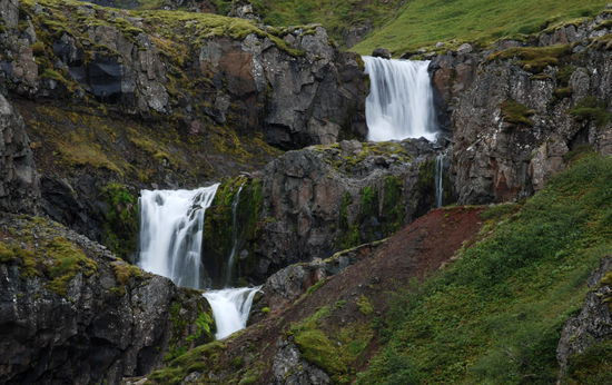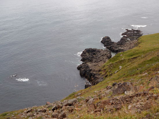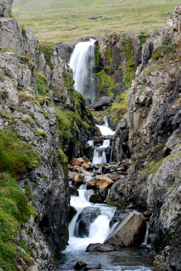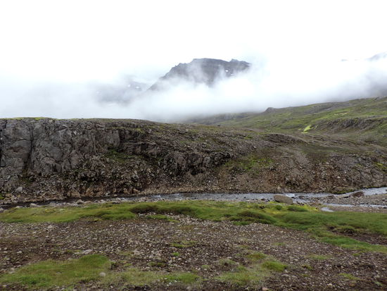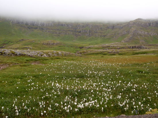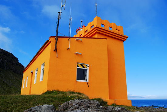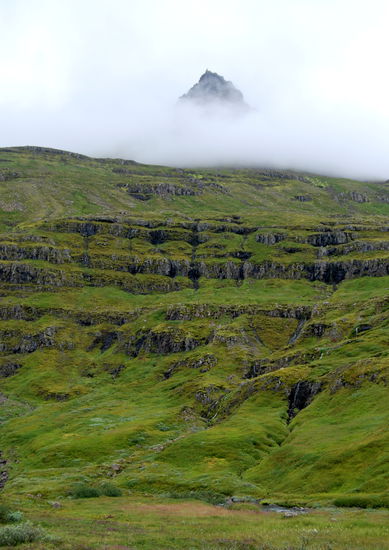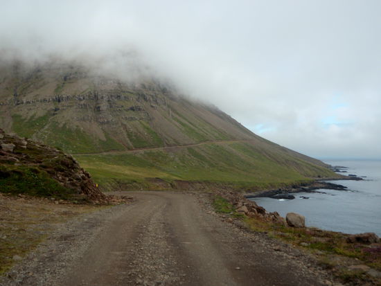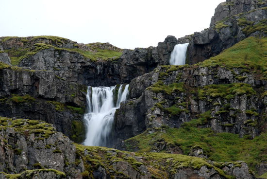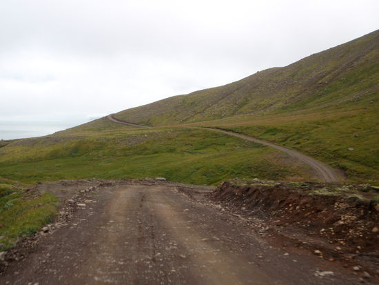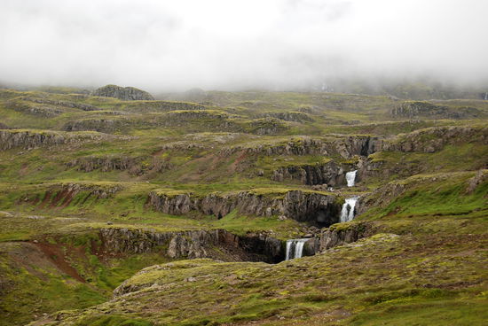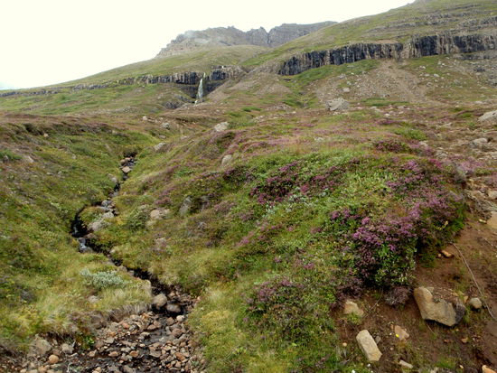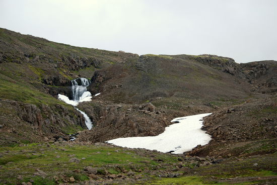 Am letzten Tag, nach 5 Wochen auf Ísland, machte wir noch einen Ausflug zum Leuchtturm „Dalatangi” an der Einfahrt zum Seyðisfjörður. Man sieht ihn als ersten Gruß von Ísland bei der Ankunft und als letzten bei der Ausfahrt. Er ist nur vom südlichen Nachbarfjord Mjóifjörður über eine Schotterpiste erreichbar. Auf einer Informationstafel hatten wir gesehen, daß es auf dem Weg einen schönen Wasserfall geben sollte. So fuhren wir von Egilstaðir ein Stück zurück auf der 92 und bogen dann auf die 953 ab. Langsam stieg die Schotterpiste in einem hübschen Tal an. Rechts und links sahen wir schon einige Wasserfällen. Welches war nur der beschriebene? Am höchsten Punkt lagen unter tiefhängenden Wolken einige kleine Seen. Dann ging es in steilen Serpentinen bergab zum Fjord mit herrlichen Ausblicken. Nun sahen wir auch unseren Wasserfall, der in Kaskaden vom Berg stürzte. Weiter ging die Fahrt am Fjord entlang durch eine kleine Ortschaft. Danach stieg der Weg an und führte am Meer entlang, teilweise recht hoch, bis wir den leuchtend orangen Leuchtturm erreichten. Daneben stand noch der winzig kleine alte. Wir strolchten ein Weilchen dort herum und machten uns dann bald auf den Rückweg.