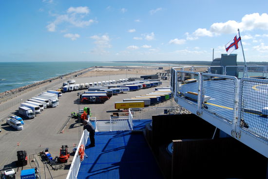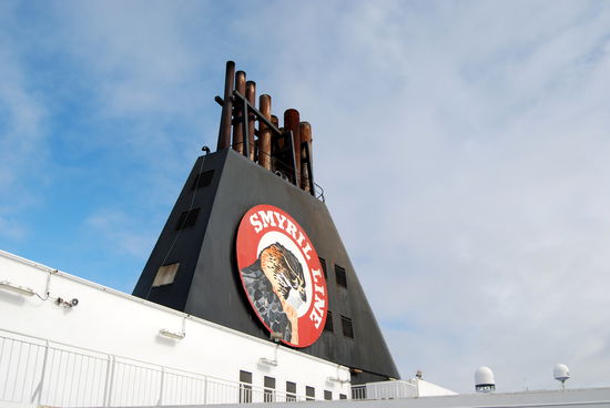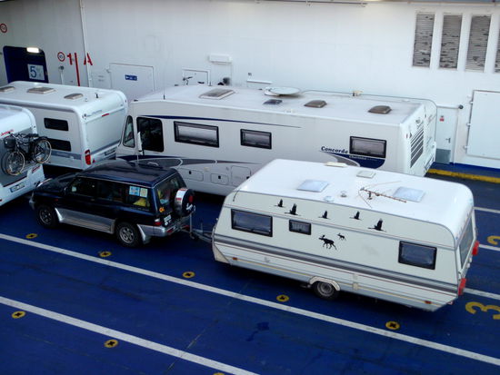 Spätestens um 9 Uhr mußten wir am Fähranleger sein. So fuhren wir schon kurz nach 8 Uhr, als die Fähre schon einlief, zum Empfangsgebäude hinüber, um unsere Tax free-Unterlagen beim Zoll abzugeben. Danach fuhren wir noch einmal durch den Ort zum Fähranleger. Wir wurden gleich in die Spur der Wohnwagen eingereiht, wo wir dann mit 3 anderen Gespannen warteten. Hier wurden die Fahrzeuge wieder nach Arten sortiert und in den verschiedenen Spuren aufgestellt. Einige größere Fahrzeuge mußten nach dem Passieren der Sperre wieder nach draußen zu einem speziellen Aufstellplatz fahren.
