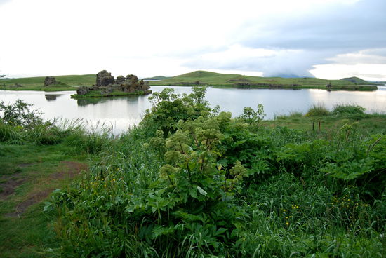 Gegen Abend machten wir trotzdem noch einen kleinen Ausflug nach Höfði. Dies ist ein geschütztes parkähnliches Gebiet mit angelegten schmalen Wegen und fantastischen Ausblicken auf den Mývatn. Viele beeindruckende Lavaformationen ragten aus dem Wasser oder säumten den Rand. Es ist ein Paradies für Vögel, und wir hatten wieder das große Glück, ein Eistaucherpärchen zu sehen. Höfði war eine richtige Überraschung für uns, denn es ist ein richtiger aber gepflegter Urwald mit hohen Fichten, Lärchen, Ebereschen und anderen Laubbäumen. Unter den Bäumen wuchsen hauptsächlich große Engelswurzstauden. So schöne und so viele hatten wir noch nie gesehen. Das war ein großartiger Ausflug.