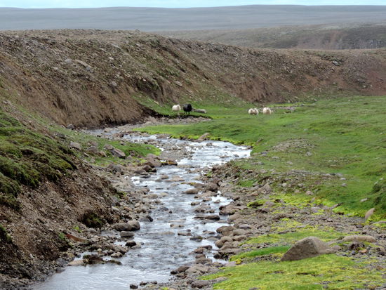 Wir duschten noch einmal, denn es war ja fraglich, wann wir das nächste Mal dazu kommen würden. Die Fahrt auf der F756 war ganz toll. Der Weg war sehr gut befahrbar. Er schlängelte sich bergauf und bergab. Lange begleitete uns ein Fluß, der mal schmal und reißend war, dann wieder mäanderte. Sehr viele Schafe weideten hier und verließen schnell den Weg, als wir kamen. Ein Regenpfeifer trippelte vor uns her, um dann laut rufend zu verschwinden. Ab und zu kam ein Wagen entgegen. In der Ferne tauchten hohe Berge auf, auf denen noch viele Schneefelder zu sehen waren. Wir kamen an zwei schönen Seen mit vielen Vögeln vorbei. Wir entdeckten einen Sterntaucher. Bald danach tauchte ein großer Stausee auf, auf dessen Damm der Weg verlief. Ab einer Kreuzung ging es auf der 35 weiter. Dieser nördliche Teil wirkte auf uns wie eine Autobahn, so gut war der Weg. Erst kurz vor dem Abzweig nach Hveravellir, wo wir auf den südlichen Teilen der Strecke stießen, war der Weg viel schlechter.