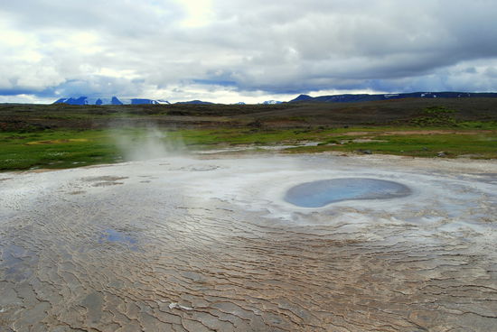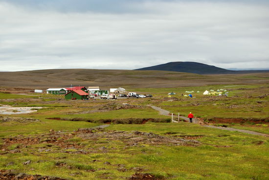 Dann war der Fauchi erreicht. Da die Pkw nicht mit auf die Zeltwiese durften, war es etwas schwierig, einen Platz so finden, wo unser Auto möglichst dicht am Zelt stand. Wir bauten auf und machten dann eine kleine Runde durch das Sulfatarenfeld und anschließend einen Spaziergang zu einer kleinen Höhle. Da es ungemütlich kühl war, aßen wir im Auto. Neben uns parkte ein Land Rover mit Dachzelt aus Bonn ein. Wir kamen mit dem Paar ins Gespräch und saßen noch eine Weile mit ihnen im Aufenthaltsraum zusammen. Sie wollten ungefähr dieselbe Strecke fahren wie wir. Mal sehen, ob wir sie wiedersehen. Wir schliefen gut und haben nicht gefroren. Christa hat uns immer ein wirklich gutes Lager gebaut: Auf den Zeltboden kam eine dicke, mit Alufolie kaschierte „Picknickunterlage“, darauf unsere ca. 20 cm hohe Luftmatratze, ein sog. Luftbett. Darauf eine Fliesdecke und das Laken. Zugedeckt haben wir uns mit unserer normalen großen Zudecke aus dem Wohnwagen und darüber eine Fliesdecke. Allerdings hatten wir auch noch unsere Fliesträningsanzüge an.