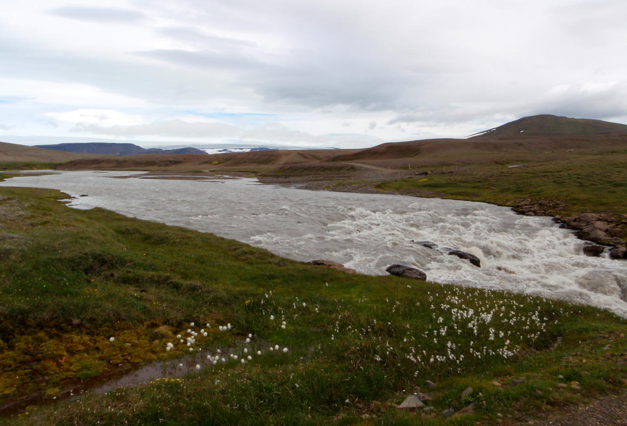 So gut durchgewärmt ging die Fahrt auf der 35 weiter. Wir wurden ganz schön durchgeschüttelt. Dann kam der Abzweig nach Kerlingarfjöll. Schon nach einer kurzen Strecke hielten wir an. Ein herrlicher Wasserfall stürzte sich tosend in eine Schlucht, grandiose zerklüftete Felswände links und rechts. Es kamen uns öfter Autos entgegen. So viel Verkehr hatten wir hier gar nicht erwartet. Schneller als gedacht erreichten wir den Campingplatz Kerlingarfjöll. Malerisch lag er in einer Senke am Fluß, dahinter ein Berg mit einer interessanten Steilwand. Nach dem Zeltaufbau und einer Kaffepause fuhren wir dann aber erst einmal noch weiter in die Berge. Steil und mit vielen Kurven ging die Straße bergan. Immer wieder hielten wir an, um diese grandiose Landschaft aufzunehmen. Durch tiefe Canyons rauschten die Flüsse. Dann, nach einem weiteren Anstieg, tauchte das große Geothermalgebiet auf. Die Berge leuchteten in gelb, braun, ocker bis zu Rottönen. Überall stiegen kleine Dampfwölkchen auf. Das gesamte Gebiet ist über Wege und viele steile Treppen zu erwandern. Es roch stark nach Schwefel. Die Erde blubberte und brodelte, in den Tälern, nach jeder Kurve gab es neues zu sehen, und überall floß Wasser, das man über Brücken überqueren konnte. Welch schöner Abschluß dieses Tages.