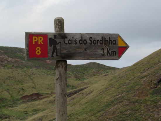 Wir blicken auf die Casa do Sardinha. Wie eine kleine Oase liegt sie dort. Unter den Palmen findet man auch Picknickbänke. Unser Ziel ist jedoch der Gipfel Ponta do Furado.