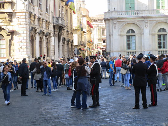 Palazzo del Seminario dei Chierici am Piazza dell’ Duomo: Das ehemalige Priesterseminar ist über die Porta Uzeda mit dem Dom verbunden. Es wurde nach dem Erdbeben von 1693 erbaut. Die massive Fassade ist von Lisenen eingerahmt und mit eng gesetzten Kragsteinen verziert. Vor dem schönen Palazzo sehen wir zwei schicke junge Carabinieri auf ihren Motorrädern.