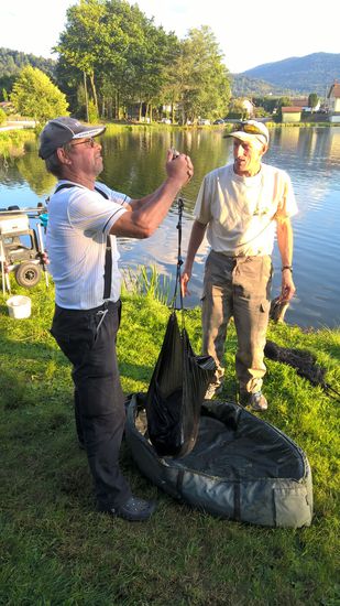Während ich an meinen Aufzeichnungen weiter schreibe, macht Rolf sich auf, um den Anglern zuzuschauen. Die sind über sein Interesse ganz aus dem Häuschen, zeigen ihm ihre Prachtexemplare, die verwogen, vermessen und dann wieder in den See gesetzt werden. Das ist ja eine merkwürdige Art des Angelns. Ich muss das mal erforschen im Internet.