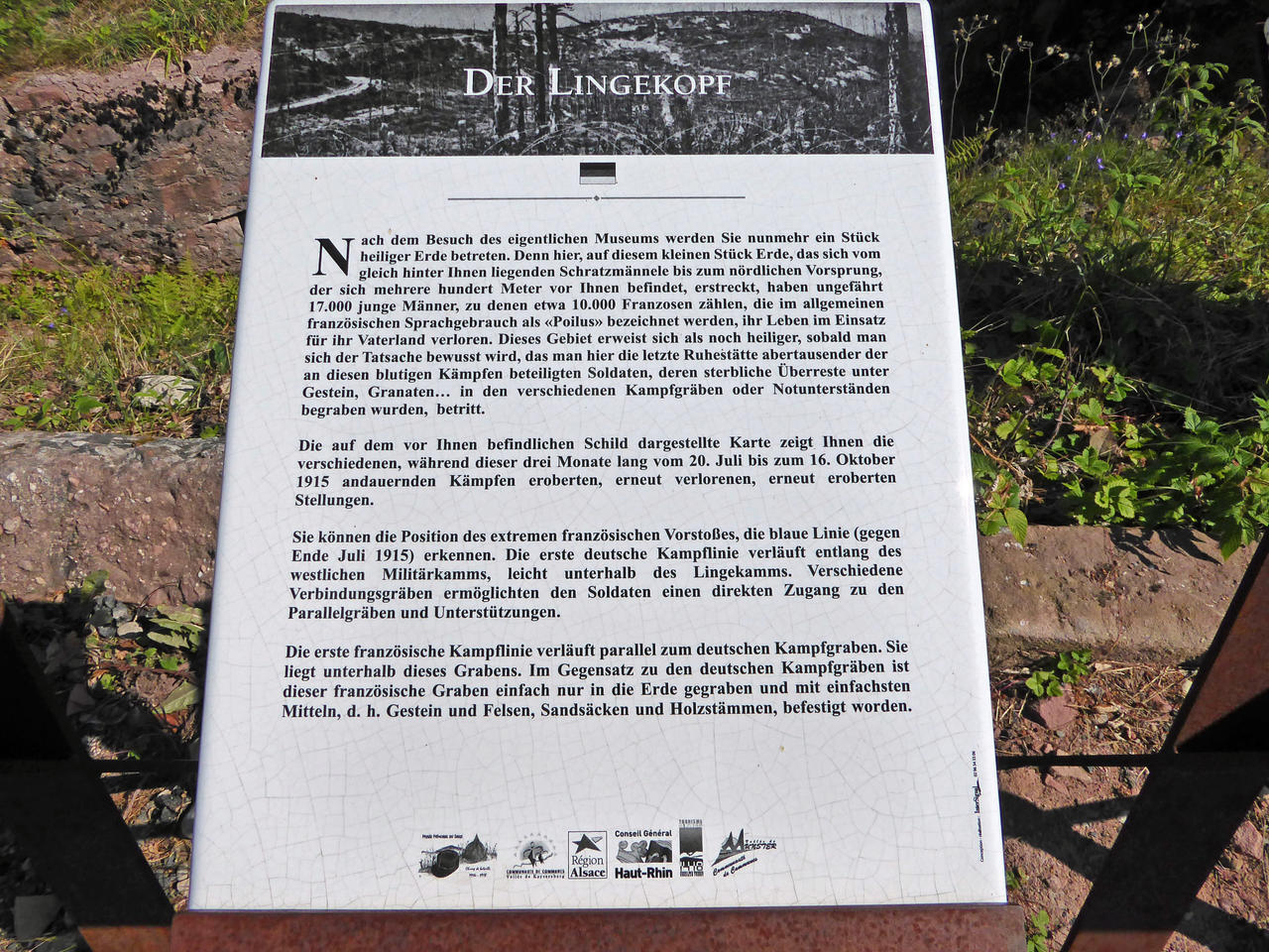 Männer, die im Schlamm der Gräben festsitzen, die nur langsam vorankommend durch die unerkenntlichen Körper der Todesopfer des Vortages hindurch ziehen, die am Stacheldraht hängengeblieben sind, die durch das Gas blind geworden sind, die von den Flammenwerfern verbrannt worden sind, die vom Granatenhagel erschlagen worden sind, die von den Granaten zerrissen worden sind, die von Maschinengewehren durchlöchert worden sind, die sich einer nach dem anderem im Nebel verloren haben, die von der Sonne zu Tode gegerbt worden sind oder die den harten Bedingungen des Vogesenwinters nicht standhalten konnten - das ist der wahre Leidensweg der Kämpfer des Lingekopfes, dieser jungen Kämpfer, die 1915 erst 18, 19 und 20 Jahre alt gewesen sind.