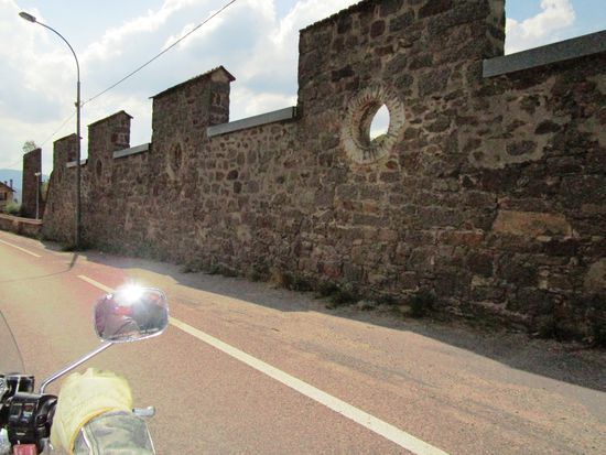 Das Kassenhäuschen ist geschlossen, das Tor ist offen, niemand zu sehen. Wie wir später erfahren, kann man alles (Eintritt 6 Euro) nur von 14 bis 18 Uhr anschauen. Uns stört das nicht. Die Kirche ist geöffnet, so dass wir hinein sehen können und die nahen Gartenanlagen sind auch zu besichtigen.