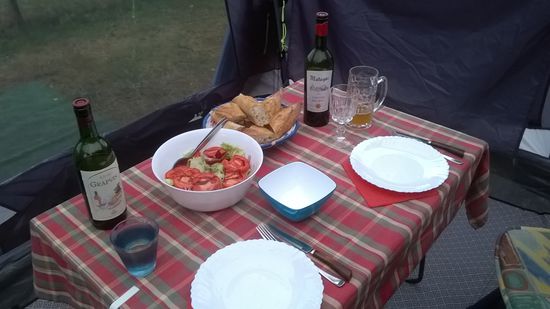 Für heute ist Dauerregen angesagt. Uns kann das nicht stören. Wir haben genug Lesestoff und Filme dabei. Unser Heizofen hält alles gut warm, das Zelt ist auch super isoliert.