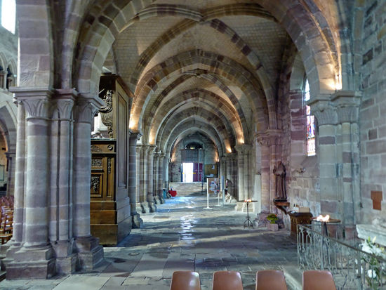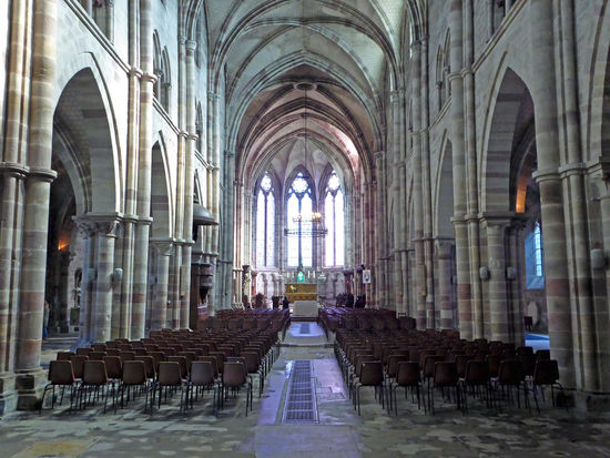 Der weite Innenraum in burgundischer Gotik ist dreischiffig mit Querschiff und langgestrecktem Chor.