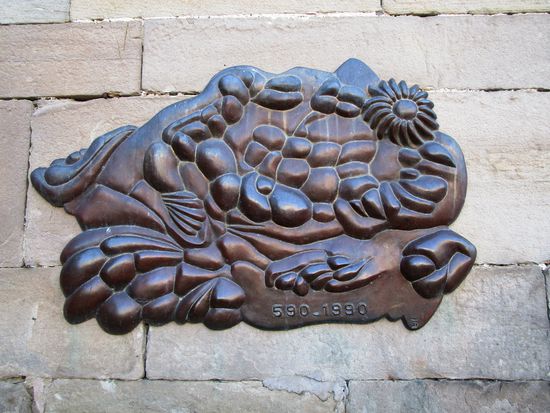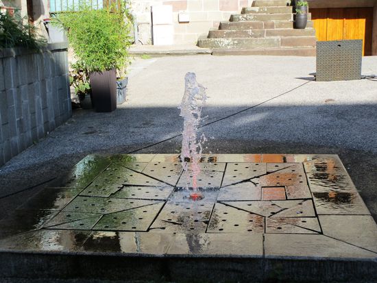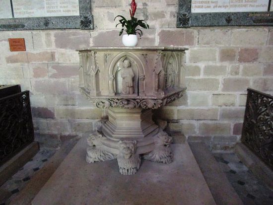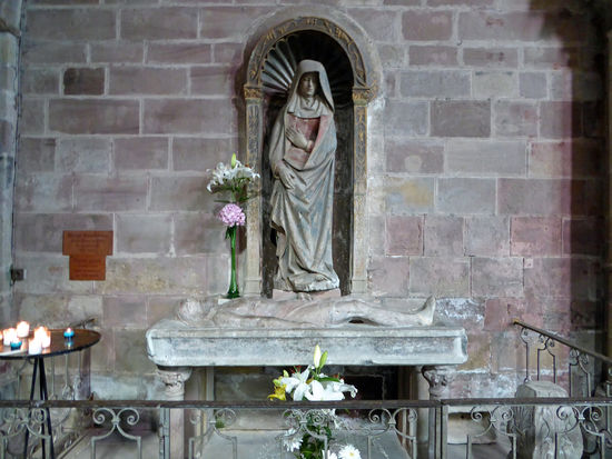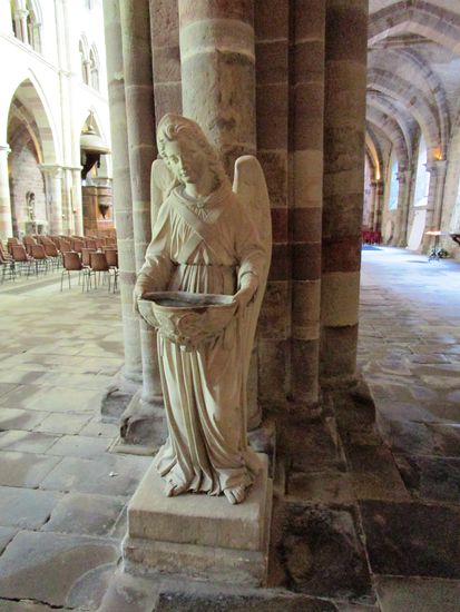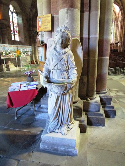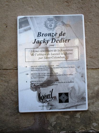 Außen an der Kirche ist eine Bronzeskulptur angebracht, von Jacky Dedier, zum Bestehen der Abtei von 590 bis 1990 (1400 Jahre!). Sieht sehr schön aus und welch Wunder, die Erklärung auch in Deutsch und Englisch.