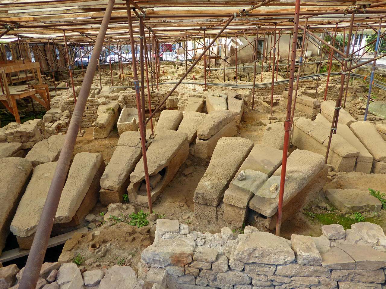Wir stoßen auf Ausgrabungen mitten in der Stadt. Leider kann ich hier vor Ort keine näheren Informationen in Englisch oder Deutsch finden. Es handelt sich wohl um über die Überreste einer frühchristlichen Kirche - Saint-Martin de Luxeuil-les-Bains. Im Jahr 2006 sollte auf dem Platz der Republik ein Parkplatz errichtet werden. Während der Bauarbeiten 2008/2009 stieß man auf die Überreste der Kirche von Saint Martin, die seit 2010 unter Denkmalschutz stehen. Auch das Grab von Saint Valbert, dem dritten Abt von Luxeuil um 670, wurde hinter dem Altar in der Krypta der Kirche gefunden. Es wurden zudem Gebäudereste aus dem 2. Jh. n. Chr. entdeckt, sowie 125 Gräber, was eine Nekropole vermuten läßt.