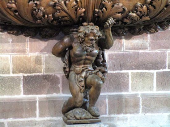 Die Orgelempore wird von einem kauernden Atlanten gestützt. Die darüber liegende riesige geschnitzte Holzkonsole wird von 4 Atlanten gehalten. Alles aus einem einzigen Stück Eiche geschnitzt.