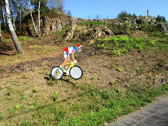 Wir folgen der GR 59 durch den Bois de Fresse. Dies ist ein herrlicher Wald, wild und naturbelassen. Wir fahren wieder über einen, noch abenteuerlicheren, Forst-Weg hinauf auf den Roc du Plainet, 806 m. 200 Höhenmeter sind hier auf kurzer Distanz zu überwinden. Für Fahrradfahrer anstrengend, für uns weniger.