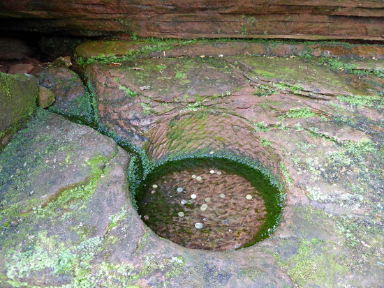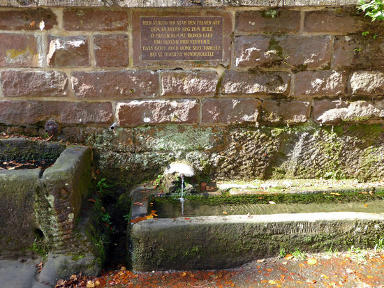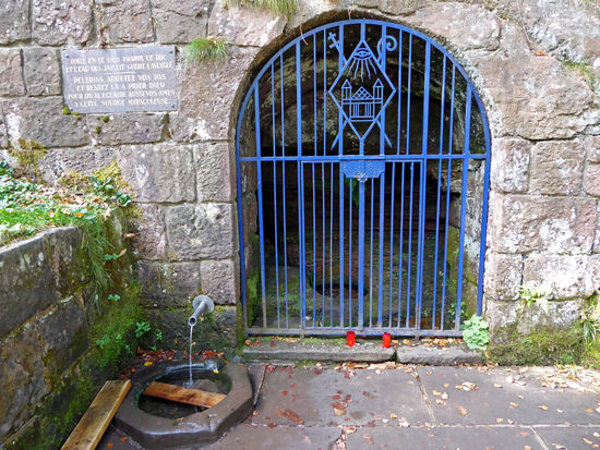 Kurzer Halt an der Quelle der Heiligen Odile. Der Quelle sagt man eine wundertätige Wirkung nach. Rolf trinkt natürlich dort am Brunnen und füllt auch seine mitgebrachte Flasche mit dem Heilwasser. Wenn man denn daran glaubt. Die Heilige Odile soll hier einem alten Mann zu trinken gegeben haben, der um die Heilung seines blinden Kindes bat.