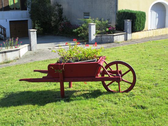 Wir halten an der schönen Kirche Saint Antide. Auf dem Rasen vor der Kirche sticht einem sofort ein mit Blumen geschmückter Schubkarren ins Auge.