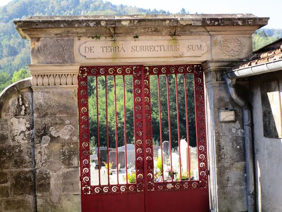 Ehe wir weiterfahren, werfe ich noch einen Blick in den angrenzenden Friedhof, dessen prächtiges altes Portal leider verschlossen ist.