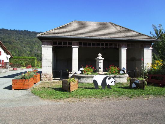 Beim Verlassen des Ortes Fresse kommen wir noch an einem alten Waschhaus – Lavoir – vorbei. Der davor befindliche Brunnen, blumengeschmückt, ist dekoriert mit einigen Pandabären. Sieht witzig aus.