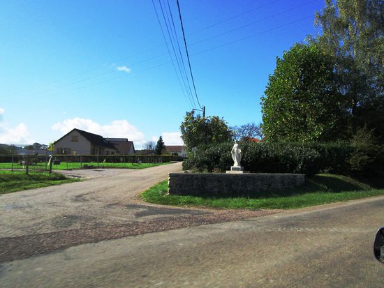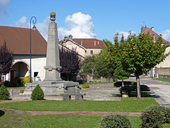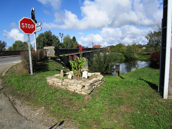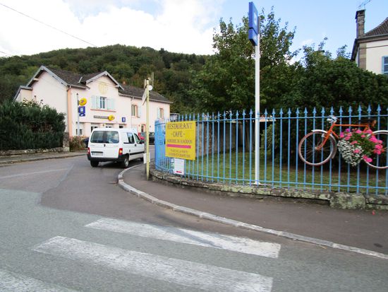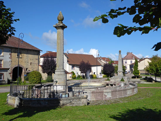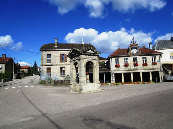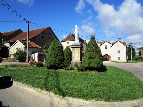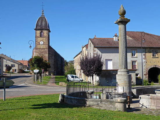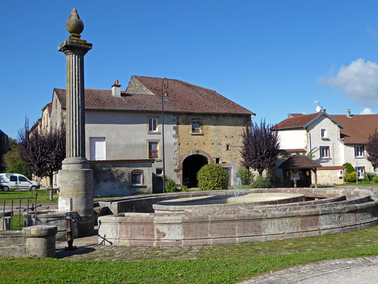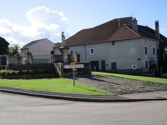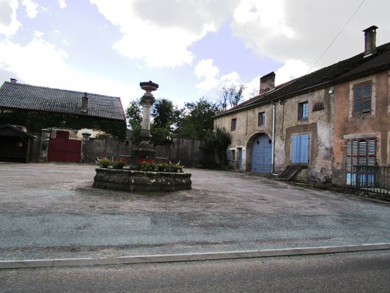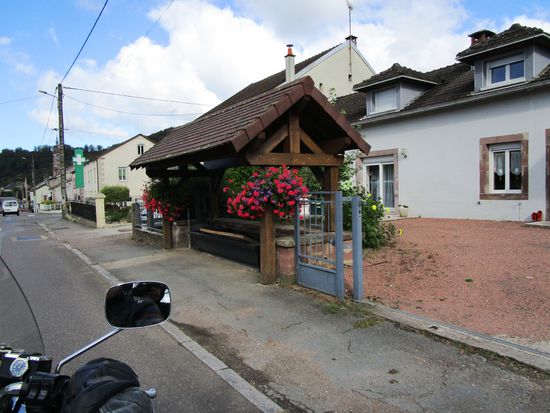 Wir halten in Meurcourt am Dorfbrunnen mit zwei Säulen. Ein steinernes Wegkreuz auf dem Dorfplatz ist auf das Jahr 1630 datiert.