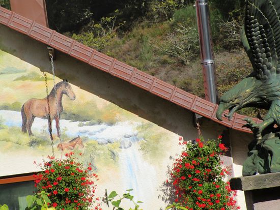 Beim Abstieg in den Ort kommen wir an einigen interessanten Häusern vorbei, die ich natürlich alle fotografieren muss, was Rolf sehr zu amüsieren scheint. Er ist mir mal wieder mit seinem Wanderschritt voraus geeilt. Ich kann da kaum nachkommen. Unterwegs begegnet uns mal wieder eine Katze. Rolf weiß um meine Katzenliebe und macht ein schönes Foto.