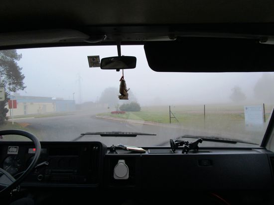 Gegen 6.30 Uhr stehen wir auf. Es hat nur 2 Grad. Ganz schön kalt, zu ungemütlich zum Motorrad fahren. Heute frühstücken wir im Bus. Dann erledigt Rolf die letzten Arbeiten, Satellitenschüssel abbauen und den Rest der Sachen für die Reise gut verstauen, damit nichts kaputt geht.
