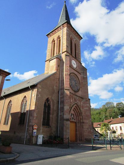 Weiter über Saales. Der Ort befindet sich im Tal der Bruche, unmittelbar an der Grenze zu Lothringen. Der Ortskern liegt mit knapp 550 m Höhe nur wenig unter der nur 300 m entfernten Passhöhe Col de Saales, der zur Wasserscheide zwischen den Einzugsbereichen von Bruch und Meurthe gehört.