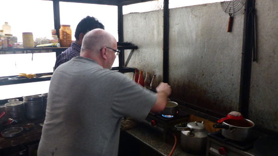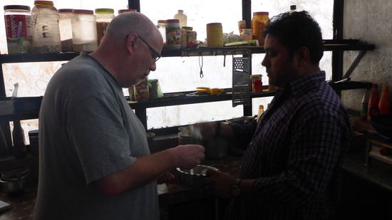 Das war ein Highlight unserer Tour, Raju hat die Mahlzeiten von gestern mit unserer Hilfe nochmal gemacht. Die Arbeitsteilung war einfach: Ich helfe Raju, Marianne schreibt die Zubereitung mit und Paul fotografiert. Essen dürfen wir alle zusammen.Und es war wieder genau so lecker wie am Tag vorher.