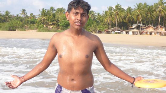 Das Wasser ist unglaublich warm, wir haben uns erst mal ein Frisbee besorgt. Manthan, der noch nie am Meer war, hat sichtlich Spaß.
