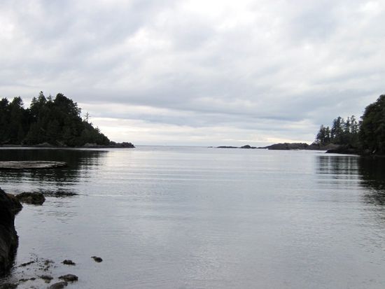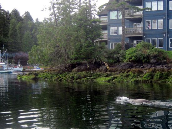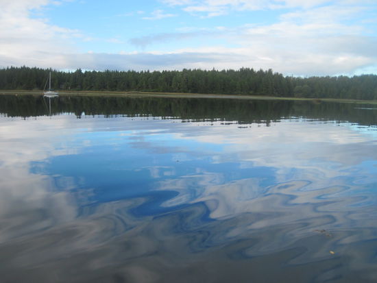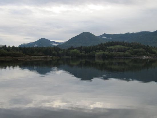 Diesmal finde ich in der Frühe doch den Zugang zum Ucluelet Inlet, einem Meeresarm nördlich von Ucluelet. Das Meer ist vollkommen ruhig und windstill, die einzige Störung der spiegelglatten Wasseroberfläche ist die von mir selber verursachte Welle.