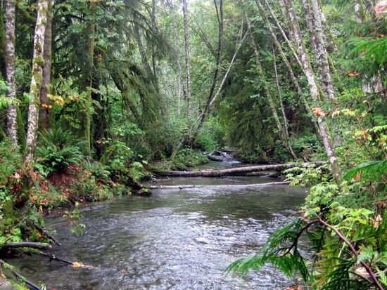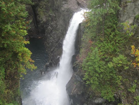 Heute verheißt der Wetterbericht ergiebigen flüssigen Sonnenschein. Ich mache mich auf den Weg nach Campbell River, etwa 50 km nördlich von Comox. Ich nehme die Küstenstraße, das dauert etwas länger, ist aber viel interessanter. An etlichen Stellen führt die Straße direkt am Meer entlang. Zunächst fahre ich in Richtung der Elk Falls, stelle aber das Auto gleich am Beginn des Canyon Trail ab. Ich nehme den Weg rechts des Campbell Rivers. Hier sind sehr viel Lachse zu sehen, für Unterwasseraufnahmen ist mir das Wetter aber zu unfreundlich.
