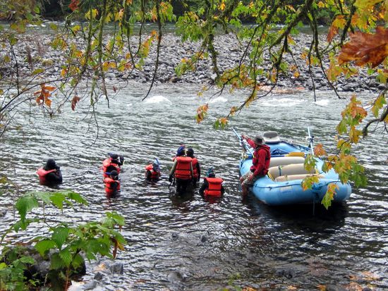 Ich treffe auf Teilnehmer einer Tour, die als Zwischeneinlage zum Rafting mit Schnorchelausrüstung die Lachse ganz nah erleben wollen.