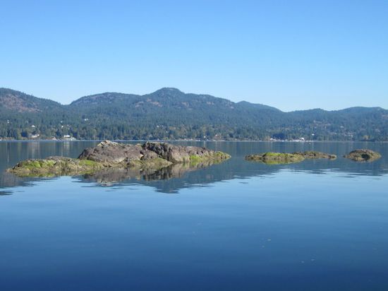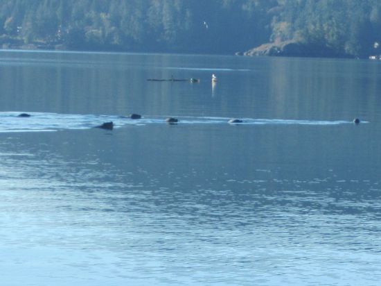 Am frühen Morgen ist es fast windstill und das Meer spiegelglatt. Nach dem wieder sehr guten Frühstück möchte ich heute das ganze Sooke Basin auf dem Paddelboard umrunden. Recht schnell bin ich in der Nähe der Ausfahrt zum Hafen. Hier gesellen sich mindestens 10 Seehunde dazu, die mich etwa eine Viertelstunde lang begleiten. Meistens halten sie einen Abstand von um die 20 m. Etwa nach der halben Runde mache ich eine Rast.